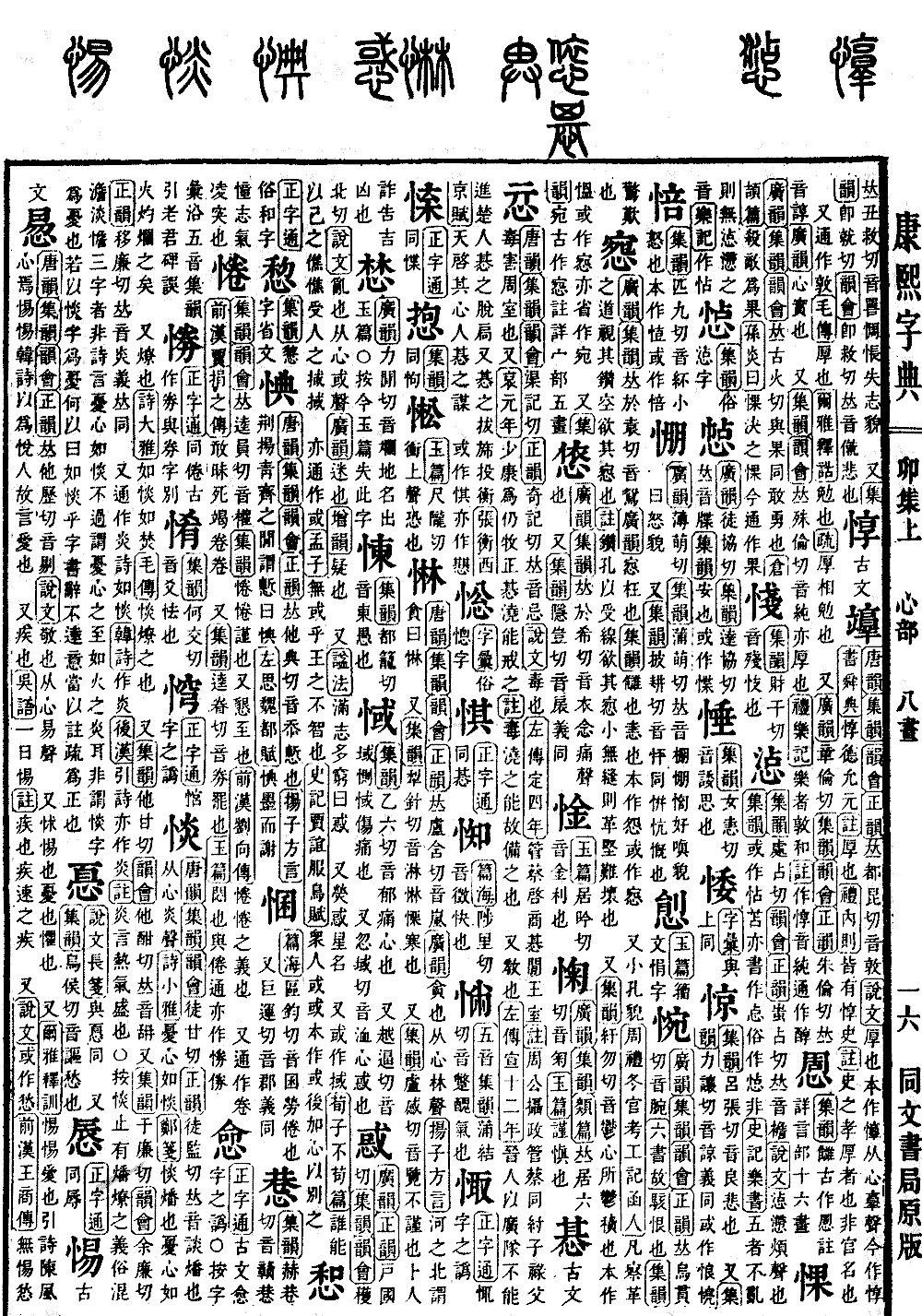 〔古文〕惖《唐韵》《集韵》《韵会》《正韵》𠀤他历切,音剔。《说文》敬也。从心易声。 又怵惕也。忧也,惧也。 又《尔雅·释训》惕惕,爱也。郭注诗云,心焉惕惕。韩诗以为悦人,故言爱也。 又疾也。《吴语》一曰惕。《注》疾也。疾速之疾。 又《说文》或作悐。《前汉·王商传》无惕悐忧。《集韵》亦作𢡕𢞫。 又叶汀药切,音托。《扬子·太𤣥经》心惕惕,足金舄,不志沟壑,舄音削。*考证:〔《尔雅·释训》惕惕,爱也。引诗陈风,心焉惕惕。韩诗以为悦人,故言爱也。〕 谨按此注文,误为经文。谨将引诗陈风四字改郭注诗云。