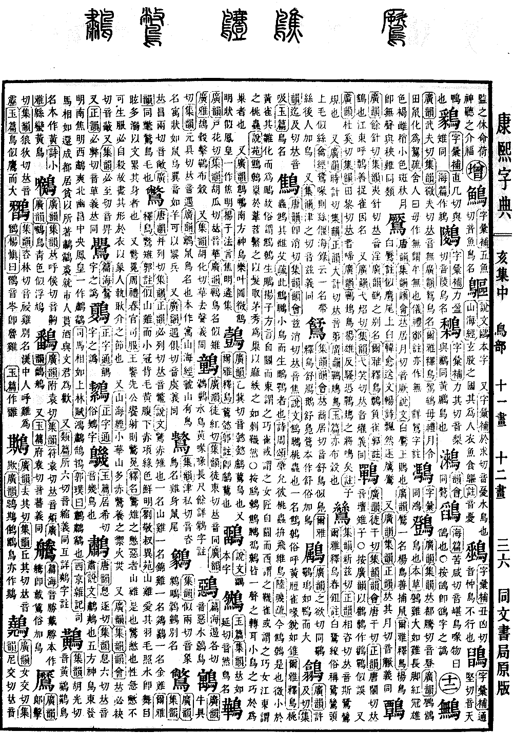 《唐韵》息逐切《集韵》息六切,𠀤音肃。《说文》鹔鷞也。五方神鸟,东发明,南焦明,西鹔爽,北幽昌,中央凤皇。一作鹔鹴。《司马相如·上林赋》鸿鹔鹄鸨。《郭璞曰》鹔,鹔鹴也。《西京杂记》司马相如还成都,居贫,以所著鹔鹴裘,就市人贳酒,与文君为欢。又《类篇》所六切,音缩。义同。互详鷞字注。