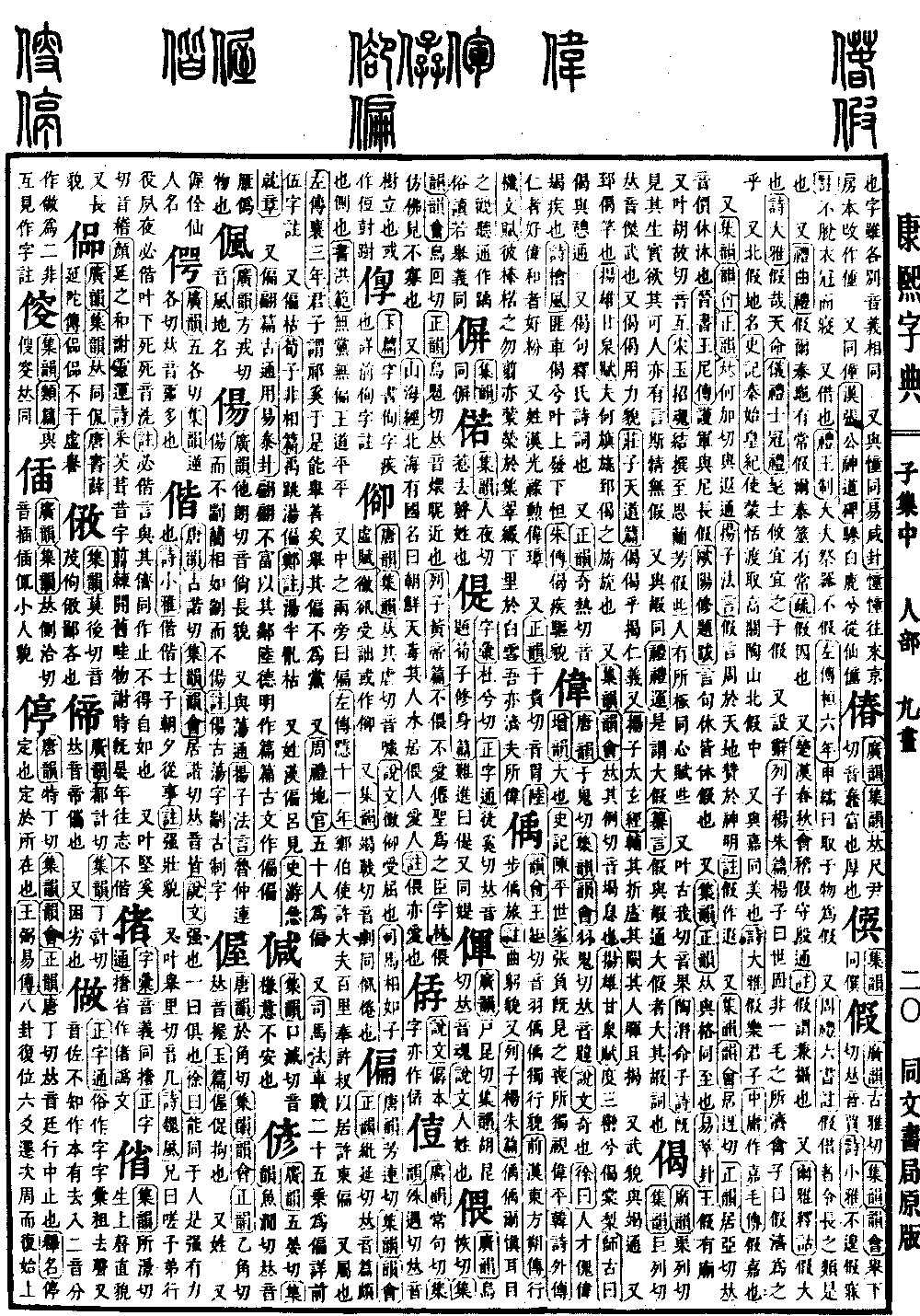 《唐韵》芳连切《集韵》《韵会》《正韵》纰延切,𠀤音篇。颇也,侧也。《书·洪范》无党无偏,王道平平。 又中之两旁曰偏。《左传·隐十一年》郑伯使许大夫百里,奉许叔以居许东偏。 又属也。《左传·襄三年》君子谓祁奚于是能举善矣,举其偏不为党。 又《周礼·夏官》疏:五十人为偏。 又《司马法》车战,二十五乗为偏。详前伍字注。 又偏枯。《荀子·非相篇》禹跳汤偏。《郑注》汤半体枯。 又姓。汉偏吕。见《史游急就章》。 又偏翩篇古通用。《易·泰卦》翩翩不富以其邻。陆德明作篇篇。古文作偏偏。*考证:〔《周礼·地官》五十人为偏。〕 谨按此夏官敍官疏文,非地官经文也。地官谨改为夏官疏。〔《荀子·非相篇》禹跳汤偏。《郑注》汤半䯆枯。〕 谨照原书半䯆改半体。