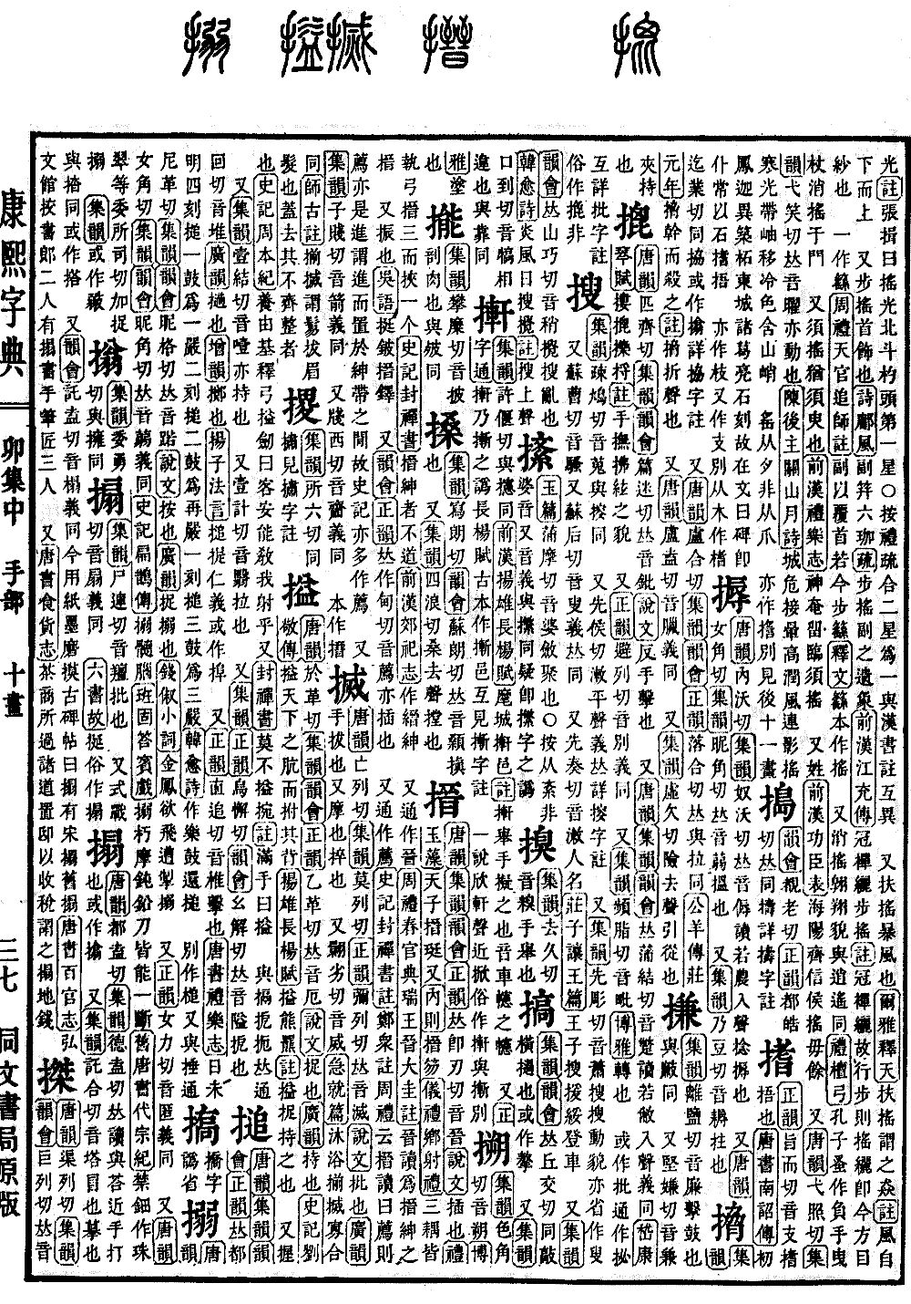 《唐韵》于革切《集韵》《韵会》《正韵》乙革切,𠀤音厄。《说文》捉也。《广韵》持也。《史记·刘敬传》搤天下之肮,而拊其背。《扬雄·长杨赋》搤熊罴。《注》搤,捉持之也。 又握也。《史记·周本纪》养由基释弓搤劒曰:客安能敎我射乎。又《封禅书》莫不搤捥。《注》满手曰搤。 与搹㧖扼𠀤通。 又《集韵》壹结切,音噎。亦持也。 又壹计切,音翳。拉也。又《集韵》《正韵》乌懈切《韵会》么解切,𠀤音隘。㧖也。