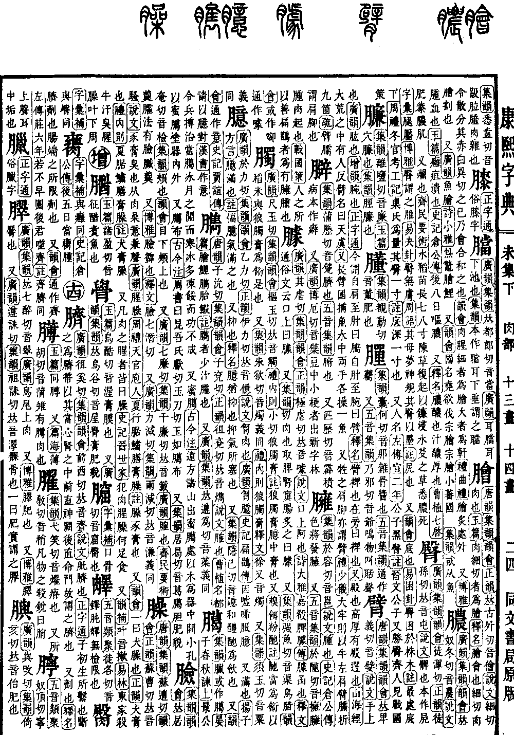 《唐韵》《集韵》《韵会》𠀤𤰞义切,音嬖。《说文》手上也。《广韵》肱也。《增韵》腕也。《正字通》今谓自肩至肘曰臑,自肘至腕曰臂。《释名》臂,裨也,在旁曰裨也。《又》殿也,高厚有殿遌也。《山海经》大荒之中有人,反臂,名曰天虞。《又》长臂国,捕鱼水中,两手各操一鱼。 又牲之肩脚亦谓臂。《礼·少仪》大牢则以牛左肩臂臑,折九个。《疏》臂臑,谓肩脚也。