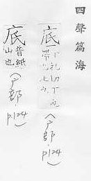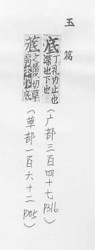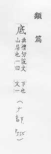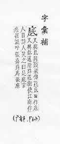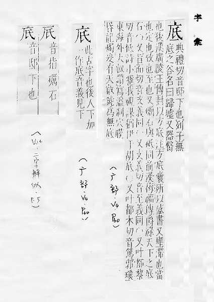 最下面的部分:~层。~座。~下(a.下面;b.以后)。海~。~肥。 末了:年~。月~。到~。 根基,基础,留作根据:刨根问~。~蕴。~稿。~版。 图案的基层:白~蓝花的瓶子。 何,什么:~事伤感。 古同抵,达到。