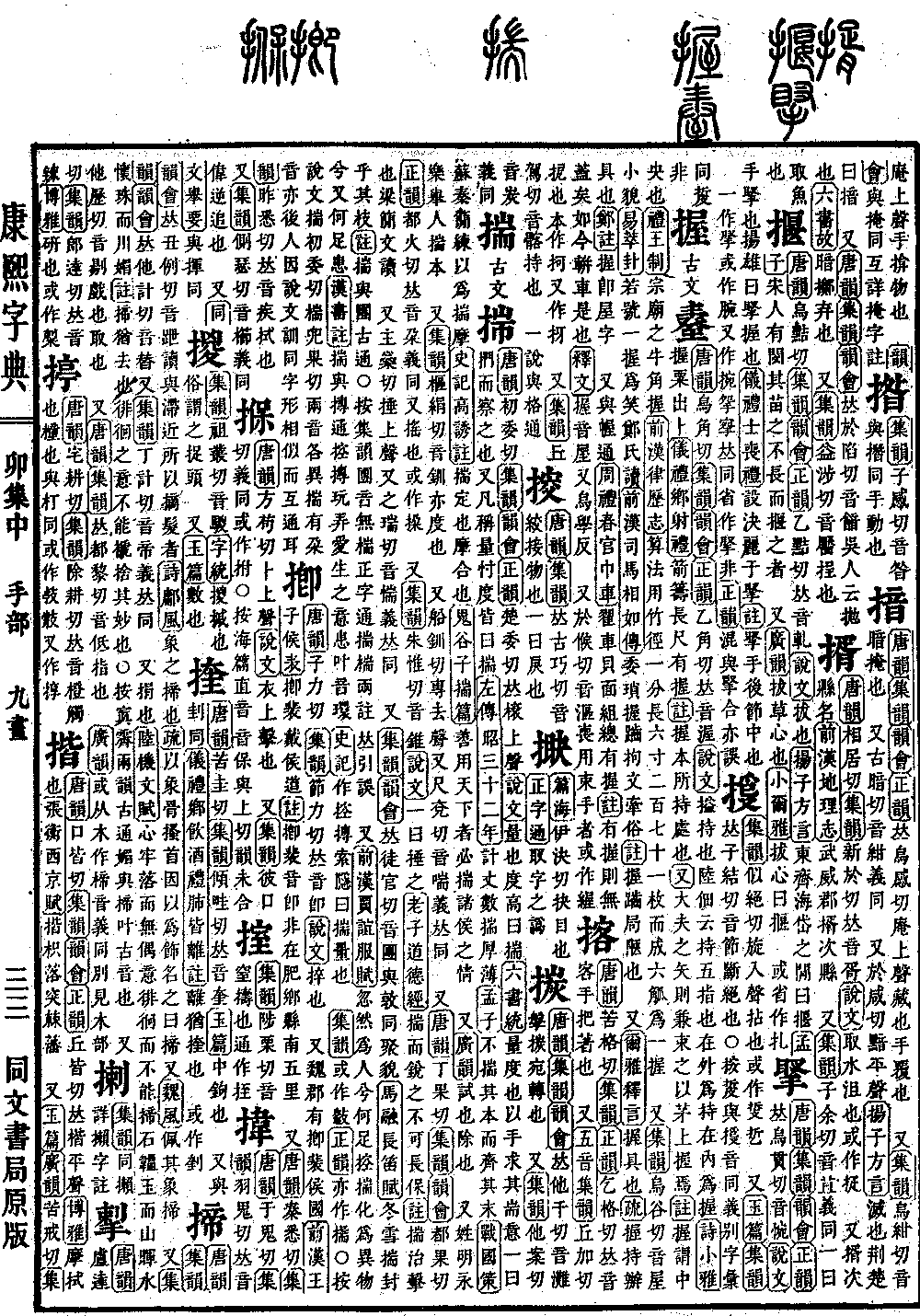 《唐韵》口皆切《集韵》《韵会》《正韵》丘皆切,𠀤楷平声。《博雅》磨也。《张衡·西京赋》揩枳落,突棘藩。 又《玉篇》《广韵》苦戒切《集韵》《韵会》《正韵》口戒切,𠀤音炌。揩排,强突也。 又与𩋧通。鼓名。《唐书·南蛮骠传》龟兹部有羯鼓,揩鼓,腰鼓。 又《五音集韵》讫黠切,音戛。敔也。擽之以止乐。《礼·明堂位》拊搏玉磬揩击。《注》揩击谓柷敔也。*考证:〔《博雅》摩拭也。〕 谨照原文摩拭也改磨也。