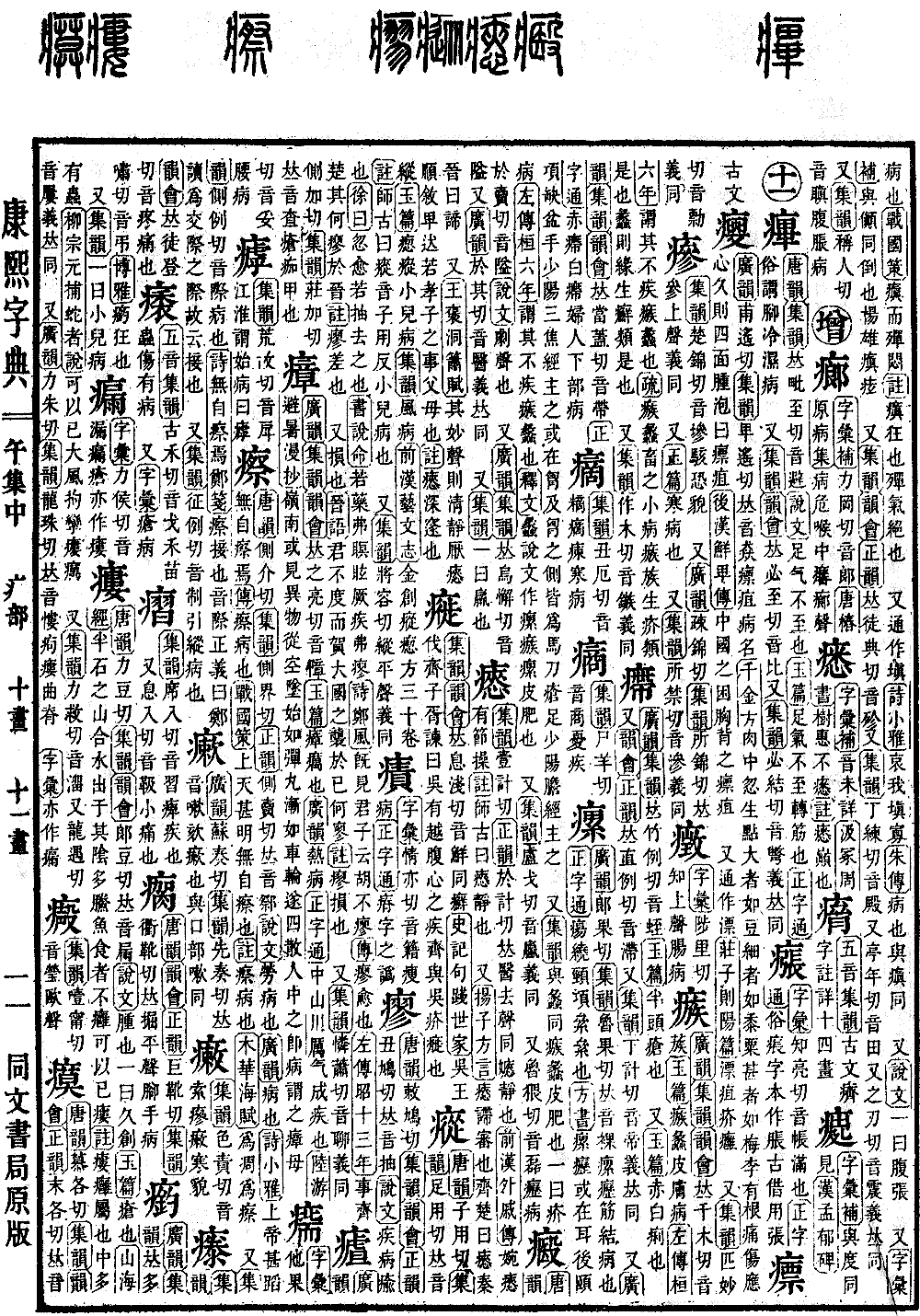 《广韵》《集韵》《韵会》𠀤之亮切,音障。《玉篇》瘴,疠也。《广韵》热病。《正字通》中山川厉气成疾也。《陆游·避暑漫抄》岭南或见异物从空坠,始如弹丸,渐如车轮,遂四散,人中之即病,谓之瘴母。