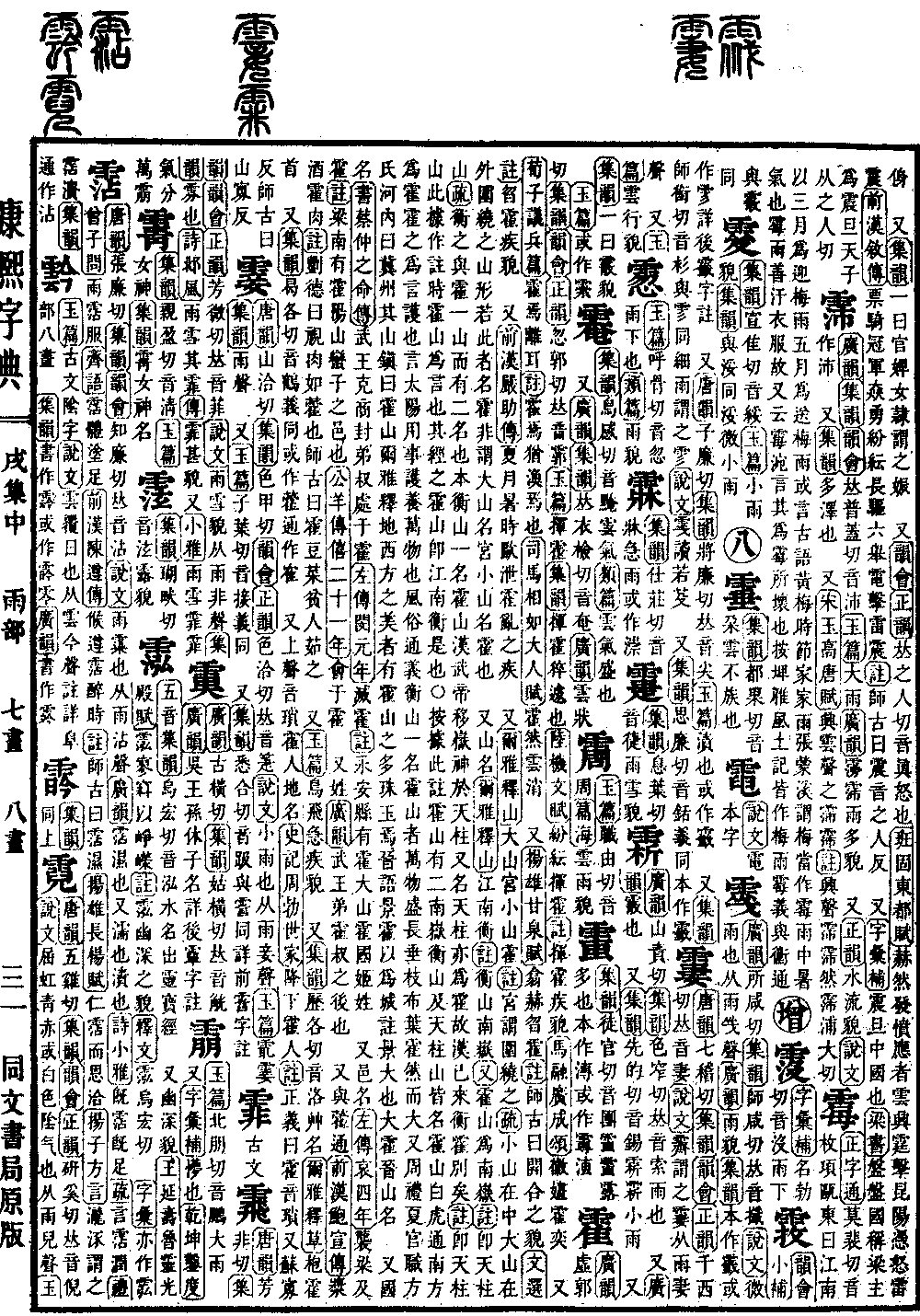 《广韵》虚郭切《集韵》《韵会》《正韵》忽郭切,𠀤音霩。《玉篇》挥霍。《集韵》挥霍,猝遽也。《陆机·文赋》纷纭挥霍。《注》挥霍,疾貌。《马融·广成颂》徽婳霍奕。 又《荀子·议兵篇》霍焉离耳。《注》霍焉,犹涣焉也。《司马相如·大人赋》霍然云消。 又《扬雄·甘泉赋》翕赫曶霍。《注》师古曰:开合之貌。《文选注》曶霍,疾貌。 又《前汉·严助传》夏月暑时,欧泄霍乱之疾。 又《尔雅·释山》大山宫,小山霍。《注》宫谓围绕之。《疏》小山在中,大山在外,围绕之。山形若此者名霍,非谓大山名宫,小山名霍也。 又山名。《尔雅·释山》江南衡。《注》衡山,南岳。《又》霍山为南岳。《注》即天柱山。《疏》衡之与霍,一山而有二名也。本衡山,一名霍山。汉武帝移岳神于天柱,又名天柱,亦为霍,故汉已来衡霍别矣。《注》即天柱山。此据作注时霍山为言也。其经之霍山,即江南衡是也。○按据此注,霍山有二,南岳衡山及天柱山,皆名霍山。白虎通:南方为霍,霍之为言护也。言太阳用事,护养万物也。风俗通义,衡山,一名霍山者,万物盛长,垂枝布叶,霍然而大。又周礼夏官职方氏:河内曰冀州,其山鎮曰霍山。尔雅释地:西方之美者,有霍山之多珠玉焉。晋语:景霍以为城。注:景,大也。大霍,晋山名。 又国名。《书·蔡仲之命传》武王克商,封弟叔处于霍。《左传·闵元年》灭霍。《注》永安县有霍大山。霍国,姬姓。 又邑名。《左传·哀四年》袭梁及霍。《注》梁南有霍阳山,蛮子之邑也。《公羊传·僖二十一年》会于霍。 又姓。《广韵》武王弟霍叔之后也。 又与藿通。《前汉·鲍宣传》浆酒霍肉。《注》刘德曰:视肉如藿也。师古曰:霍,豆菜,贫人茹之。 又《玉篇》鸟飞急疾貌。 又《集韵》历各切,音洛。艸名。《尔雅·释草》枹霍首。 又《集韵》曷各切,音鹤。义同。或作藿。通作隺。 又上声,音琐。霍人,地名。《史记·周勃世家》降下霍人。《注》正义曰:霍,音琐,又苏寡反。师古曰:山寡反。