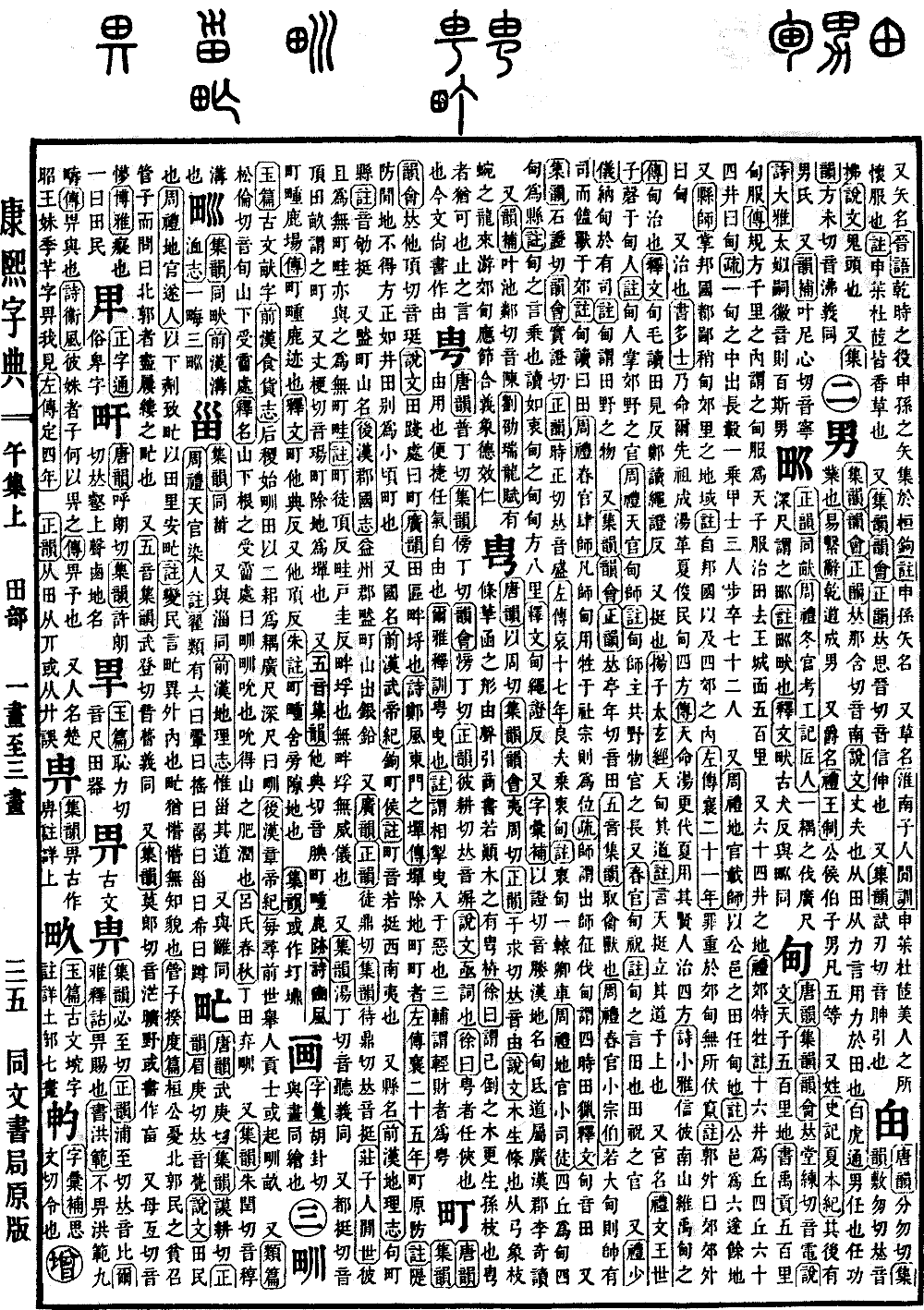 《字汇》胡卦切,与画同。绘也。*(画)〔古文〕𤱪𨽶𤲯。《唐韵》《集韵》《韵会》《正韵》𠀤胡麦切,横入声。卦画也。 又分画也。界限也。《左传·襄四年》芒芒禹迹,画为九州。《注》画分也。《礼·檀弓》哀公使人吊蒉尚,遇诸道,辟于路,画宫而受吊焉。《注》画地为宫象。 又计策也。《邹阳·上吴王书》故愿大王审画而已。《史记·荆燕世家》齐人田生游,乏资,以画干营陵侯泽。《注》服䖍曰:以计画干之也。 又截止也。《论语》今女画。 又丘名。《尔雅·释地》途出其右,而还之画丘。《注》言为道所规画。《释名》道出其右曰画。丘人尚右,凡有指画,皆用右也。 又地名。《史记·田单传》燕之初入齐,闻画邑人王蠋贤。《注》正义曰:括地志云:戟里城在临湽西北三十里,春秋时棘邑。又云澅邑,蠋所居即此邑,因澅水为名也。 又《广韵》《集韵》《韵会》《正韵》𠀤胡卦切,音话。《尔雅·释言》画形也。《注》画者为形像。《释名》画,挂也。以五色挂物象也。俗作𦘕。《周礼·天官·典丝》凡祭祀共黼画组就之物。《疏》凡祭服皆画衣绣裳。《仪礼·鄕射礼》大夫布侯,画以虎豹。士布侯,画以鹿豕。 又官名。《后汉·百官志》画室署长一人,四百石,黄绶。 又《韵补》叶胡对切,音惠。《秦瑯琊刻石》方伯分职,诸治经易。举错必当,莫不如画。易音异。