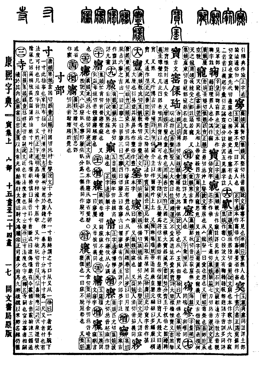 《唐韵》《集韵》仓困切《韵会》《正韵》村困切,𠀤村去声。《说文》十分也,人手却一寸,动𧖴谓之寸口。从又从一。《徐曰》一者,记手腕下一寸。此指事也。《家语》布指知寸。《前汉·律历志》度量衡皆起于黄钟之律,一黍为分,十分为寸,十寸为一尺。又寸者,忖也,有法度可忖也。凡法度字皆从寸。 又姓。《正字通》明嘉靖中梓潼令寸居敬。 又叶徒玩切,音叚。《庾信·喜晴应诏诗》伏泉远习坎,隂风已回巽。桐枝长旧围,蒲节抽新寸。叶上建传堰献。杨愼曰:巽音蒜,寸音断,或曰建传堰献在今霰韵,古音霰翰谏三韵通。*备考:《篇海类编》俗等字。