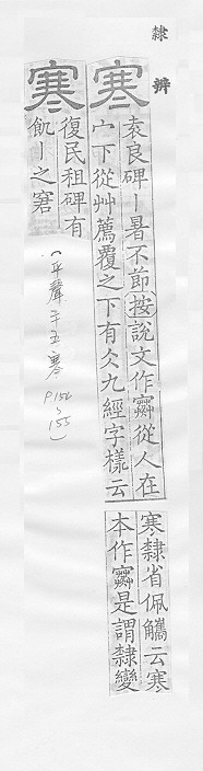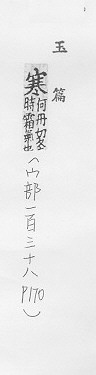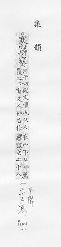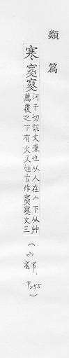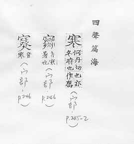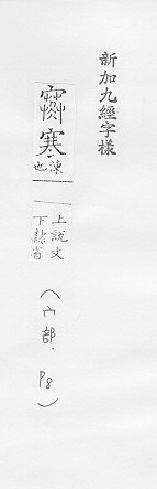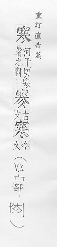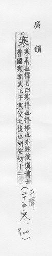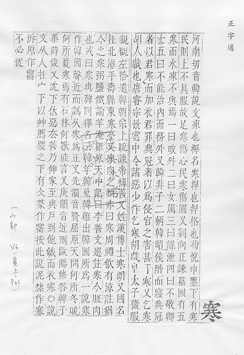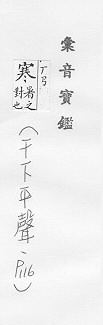 冷,与暑相对:~冬。~色。~衣。~冽。~带。~战。~噤。~食(节名,在清明前一天。古人从这一天起不生火做饭,也有的地区把清明当作“寒食”)。~喧。~来暑往。唇亡齿~。 害怕:~心。 穷困,有时用作谦辞:~门。~伧。~舍。~窗(喻艰苦的学习环境)。~酸。~士(旧指贫穷的读书人)。