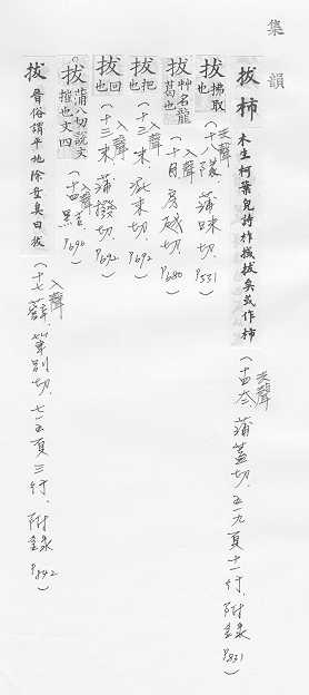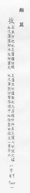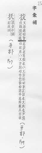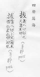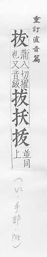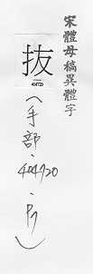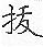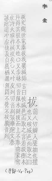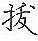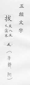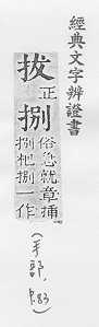 抽,拉出,连根拽出:~腿。~草。~牙。~苗助长。 夺取军事上的据点:连~数城。 吸出:~毒。~火罐儿。 选取,提升:提~。~擢。 超出,高出:海~。挺~。~地(山、树、建筑物等高耸在地面上)。~尖儿。出类~萃。 把东西放在凉水里使变凉:把西瓜放在冰水里~一~。 改变:坚韧不~。心志不可~。