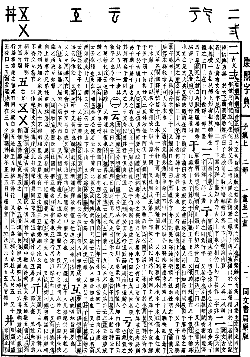 《唐韵》羽俱切《集韵》《韵会》《正韵》云俱切,𠀤音迂。《尔雅·释诂》于,曰也。 又往也。《书·大诰》民献有十夫,予翼以于。《诗·小雅》王于出征。 又《仪礼·士冠礼》宜之于假。《注》于,犹为也。宜之见为大矣。又《聘礼》贿在聘于贿。《注》于读曰为。言当视宾之礼,而为之财也。又《司马相如·长门赋叙》因于解悲愁之辞。 又未定之辞。《公羊传·僖二十八年》归于者何。归于者,罪未定也。 又行貌。《韩愈·上宰相书》于于焉而来矣。 又于于,自足貌。《庄子·应帝王》其卧徐徐,其觉于于。 又钟两口之闲曰于。《周礼·冬官考工记》凫氏为钟,两栾谓之铣,铣闲谓之于。 又《前汉·元后传》衣绛缘诸于。《注》大掖衣也。 又《唐书·元德秀传》明皇命三百里内刺史县令,以声乐集,德秀惟乐工十人,聮袂歌于蔿于。 又草名。《尔雅·释草》茜,蔓于。《注》生水中。一名轩于。《司马相如·子虚赋》庵闾轩于。 又木名。《尔雅·释木》栈木,于木。《注》僵木也。江东呼木觡。 又淳于,县名。今密州安丘县,古淳于国。 又姓。周武王第二子邘叔之后,以国为氏,后因去邑为于。又淳于,宣于,鲜于,多于,𨷖于,皆复姓。又三氏姓。勿忸于,阿伏于,见《魏书·官氏志》。 又助语辞。《诗·召南》于沼于沚。《朱传》于,于也。《周易》《毛诗》于皆作于。于于古通用。 又《集韵》邕俱切,音纡。广大貌。《礼·檀弓》邾娄考公之丧,徐君使容居来吊含。有司曰:诸侯之来辱敝邑者,易则易,于则于,易于杂者,未之有也。又《文王世子》仲尼曰:周公抗世子法于伯禽,所以善成王也。闻之曰:为人臣者,杀其身有益于君,则为之,况于其身以善其君乎。俱与迂通。 又《正韵》休居切,与吁通。叹辞。《诗·周南》于嗟麟兮。*考证:〔《礼·聘礼》贿在聘于贿〕 谨按本书之例礼记谓之礼,此出仪礼不当称礼,谨省上礼字。〔《周礼·冬官考工记》凫氏为钟,两栾谓之铣,两铣谓之于。〕 谨照原文两铣改铣闲。〔《尔雅·释木》栈木,于木。《注》僵木也。江东呼木船。〕 谨照原注木船改木觡。 〔《文王世子》周公抗世子法于伯禽,所以善成王也。仲尼闻之曰,为人臣者,杀其身有益于君,则为之,况于其身以善其君乎。俱与迂通。〕 谨按周公至其君乎皆仲尼之言,此误于闻之上增仲尼二字,谨照原文周公上增仲尼曰三字,闻之上省仲尼二字。法于益于两于字照原文改于字。