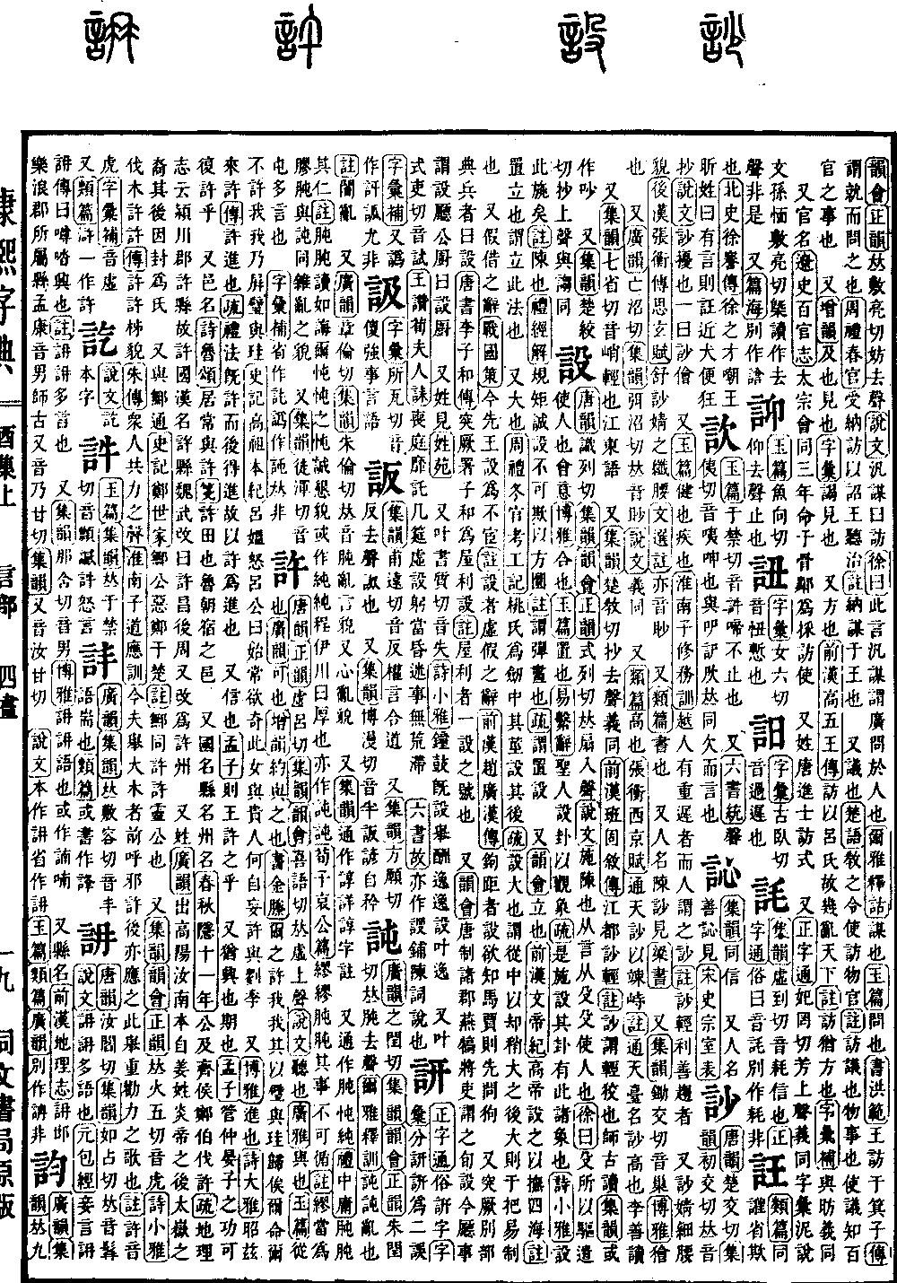《唐韵》《正韵》虚吕切《集韵》《韵会》喜语切,𠀤虚上声。《说文》听也。《广雅》与也。《玉篇》从也。《广韵》可也。《增韵》约与之也。《书·金滕》尔之许我,我其以璧与珪归俟尔命。尔不许我,我乃屛璧与珪。《史记·高祖本纪》吕媪怒。吕公曰:始常欲奇此女与贵人,何自妄许与刘季。 又《博雅》进也。《诗·大雅》昭兹来许。《传》许,进也。《疏》礼法既许,而后得进,故以许为进也。 又信也。《孟子》则王许之乎。 又犹兴也,期也。《孟子》管仲、晏子之功,可复许乎。 又邑名。《诗·鲁颂》居常与许。《笺》许,田也,鲁朝宿之邑。 又国名、县名、州名。《春秋·隐十一年》公及齐侯郑伯伐许。《疏》地理志云:颍川郡许县,故许国,汉名许县,魏武攺曰许昌,后周又攺为许州。 又姓。《广韵》出高阳汝南,本自姜姓,炎帝之后,太岳之裔,其后因封为氏。 又与鄦通。《史记·郑世家》鄦公恶郑于楚。《注》鄦同许,许灵公也。 又《集韵》《韵会》《正韵》𠀤火五切,音虎。《诗·小雅》伐木许许。《传》许许,柹貌。《朱传》众人共力之声。《淮南子·道应训》今夫举大木者,前呼邪许,后亦应之,此举重劝力之歌也。《注》许,音虎。《字汇补》音虚。 又《类篇》浒,一作许。