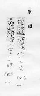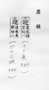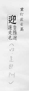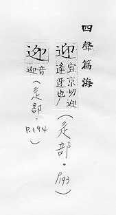 接:~接。欢~。~宾。~候。 面对着,冲着:~面。~风(a.对着风;b.随风)。~刃而解(jiě)。 揣度别人心意而投其所好:逢~。~合。