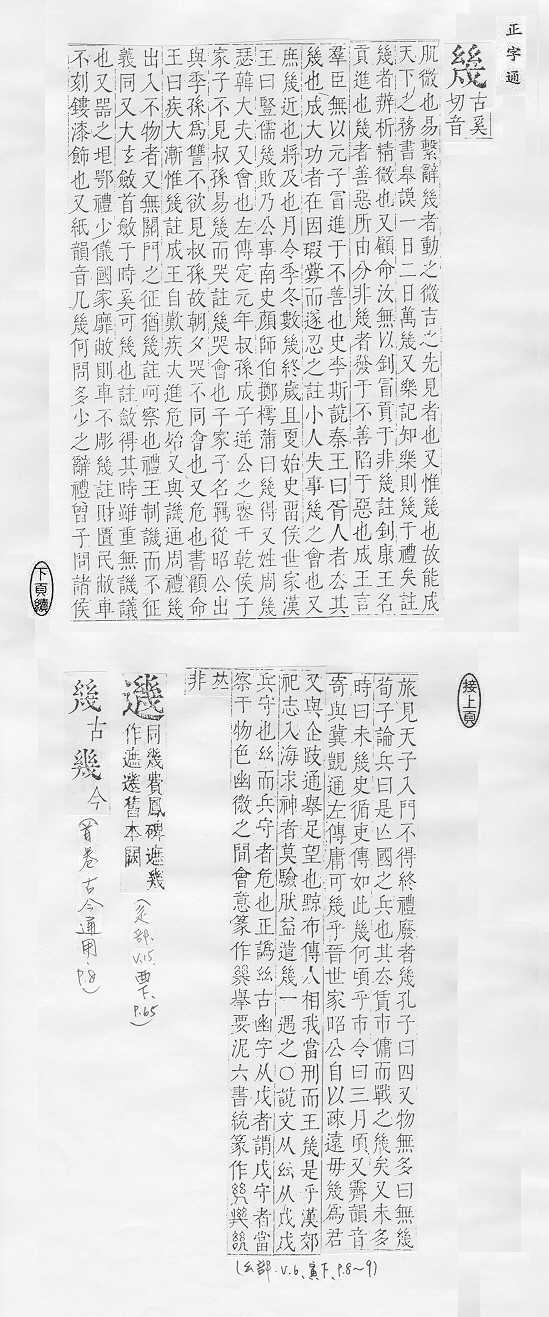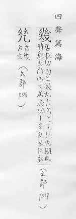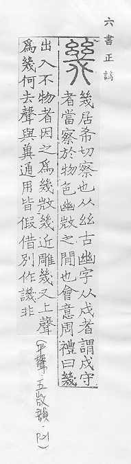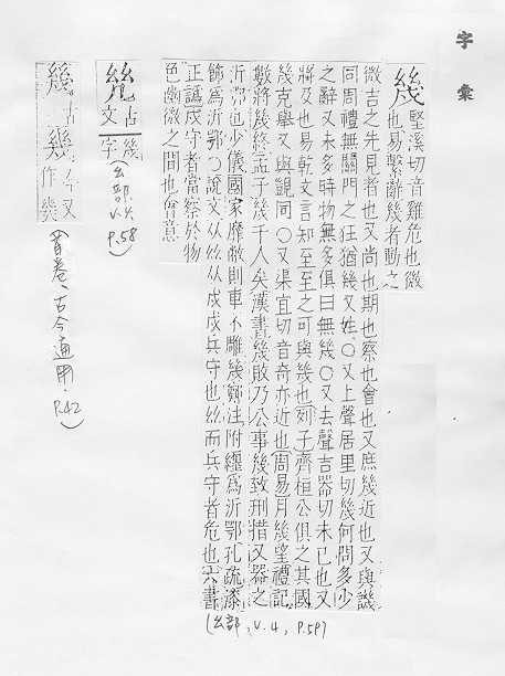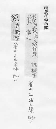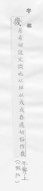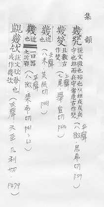 細微。見“幾希”、“幾微”等條。 危殆、危險。《詩經•大雅•瞻卬》:“天之降罔,維其幾矣。”《漢書•卷一•高帝紀上》:“楚兵罷食盡,此天亡之時,不因其幾而遂取之,所謂養虎自遺患也。” 將近、相去不遠。如:“幾及”、“庶幾”。《史記•卷五十五•留侯世家》:“漢王輟食吐哺,罵曰:‘豎儒!幾敗而公事!’” 豈。《史記•卷九十一•黥布傳》:“人相我當刑而王,幾是乎?” 預兆、細微的跡象。《易經•繫辭下》:“君子見幾而作,不俟終日。”明•方孝孺《深慮論》:“其於治亂存亡之幾,思之詳而備之審矣。” 時期、機會。《詩經•小雅•楚茨》:“卜爾百福,如幾如式。”《左傳•定公元年》:“子家子不見叔孫,易幾而哭。”