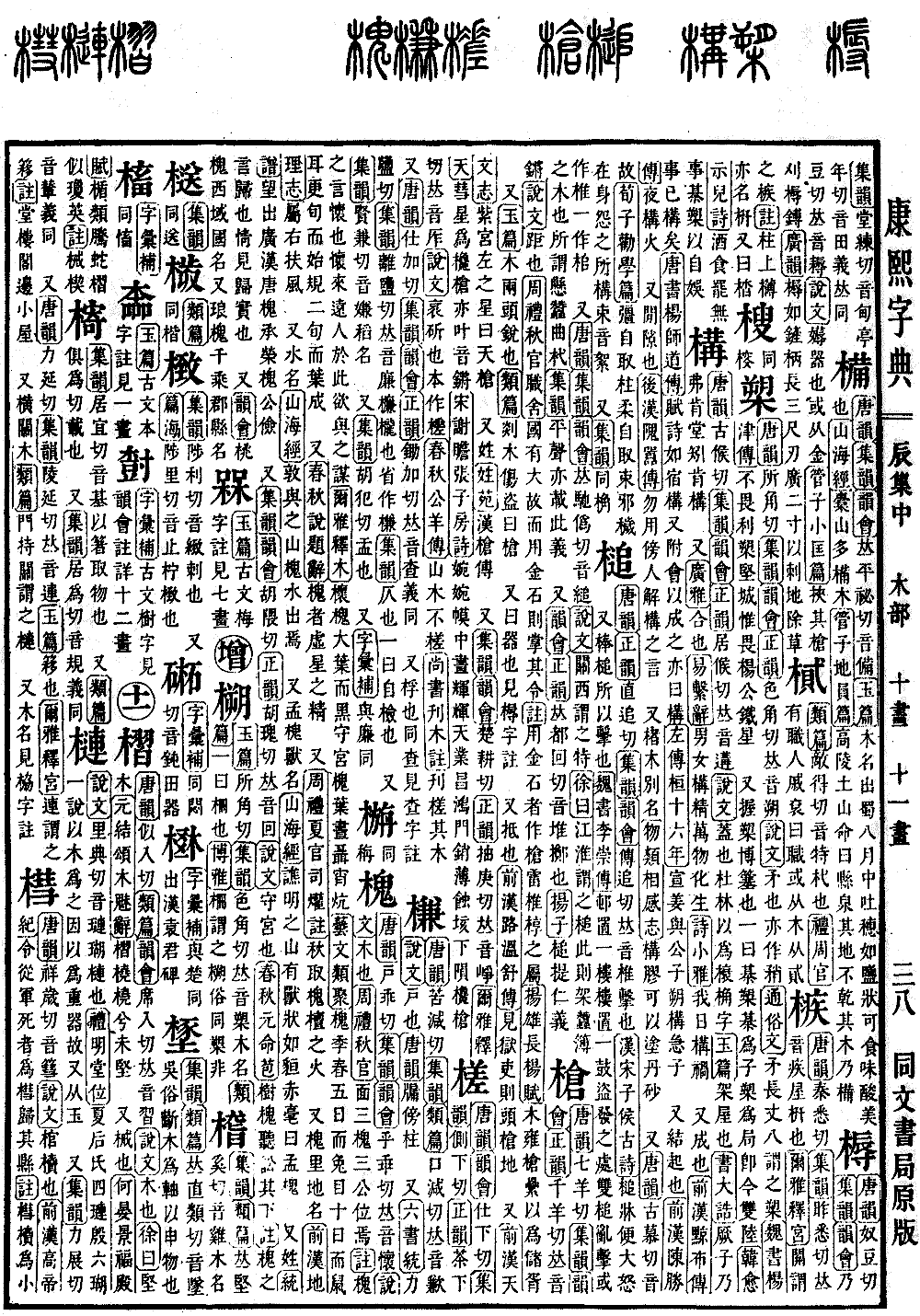 《唐韵》戸乖切《集韵》《韵会》乎乖切,𠀤音怀。《说文》木也。《周礼·秋官》面三槐三公位焉。《注》槐之言怀也。怀来远人于此,欲与之谋。《尔雅·释木》櫰槐,大叶而黑,守宫槐叶昼聂宵炕。《艺文类聚》槐,季春五日而兔目,十日而鼠耳,更旬而始规,二旬而叶成。 又《春秋·说题辞》槐者,虚星之精。 又《周礼·夏官·司爟注》秋取槐檀之火。 又槐里,地名。《前汉·地理志》属右扶风。 又水名。《山海经》敦与之山,槐水出焉。 又孟槐,兽名。《山海经》谯明之山有兽,状如貆,赤毫,曰孟槐。 又姓。《统谱》望出广汉。唐槐承荣、槐公俭。 又《集韵》《韵会》胡隈切《正韵》胡瑰切,𠀤音回。《说文》守宫也。《春秋元命苞》树槐,听讼其下。《注》槐之言归也,情见归实也。 又《韵会》桃槐,西域国名。又琅槐,千乘郡县名。