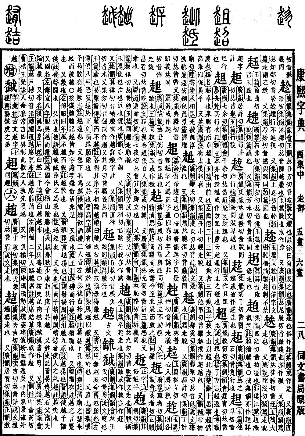 〔古文〕𦈭𧻂《广韵》《集韵》《韵会》𠀤王伐切,音粤。《说文》度也。《玉篇》踰也。《易·系辞传》杂而不越。《注》各得其序,不相踰越。《礼·曲礼》戒勿越。《疏》戒愼毋得踰越。 又《书·太甲》无越厥命。《传》越,坠也。《左传·僖八年》恐陨越于下。《注》陨越,顚坠也。 又于也。《书·高宗》越有雊雉。《传》越,于也。《诗·𨻰风》越以鬷迈。《传》越,于也。 又远也。《书·泰誓》予曷敢有越厥志。《注》越,远也。 又瑟下孔为越。《仪礼·鄕飮酒礼》二人皆左何瑟,后首挎越。《注》越,瑟下孔也。《礼·乐记》淸庙之瑟,朱絃而疏越。○按《仪礼》《礼记》越皆如字读。《字汇》音活,非是。 又躐也。《礼·王制》越绋而行事。《注》越,犹躐也。 又《礼·缁衣注》越之言蹷也。 又散也。《左传·昭四年》风不越而杀。《注》越,散也。 又《尔雅·释言》越,扬也。《注》谓发扬。《周语》汨越九原。《注》越,扬也。《晋语》使越于诸侯。《注》发声闻也。 又迂也。《鲁语》越哉,𤖔孙氏之为政也。《注》越,迃也。 又失也。《淮南子·精神训》嗜欲者使人之气越。《注》越,失也。又国名。《左传·宣八年》盟吴、越而还。《注》越国,今会稽山隂县也。《吴越春秋》少康封其庶子于越。 又姓。《史记·管晏传》越石父。《潜夫论》越象。 又布名。《后汉·马皇后纪》白越三千端。《注》白越,越布。 又与粤通。○按《史记》南越、东越,汉书作粤。 又《广韵》《集韵》《韵会》《正韵》𠀤戸括切,音活。《礼·礼运》越席疏布。《注》越席,翦蒲也。《左传·桓二年》大路越席。《注》越席,结草。《广韵》或作趏。 又《韵补》叶兪芮切。《曹植·王粲诔》人命靡常,吉凶异制。此欢之人,孰先陨越。 又叶鱼橘切。《𨻰琳·玛瑙勒赋》瑰姿玮质,纷葩艳逸。英华内照,景流外越。