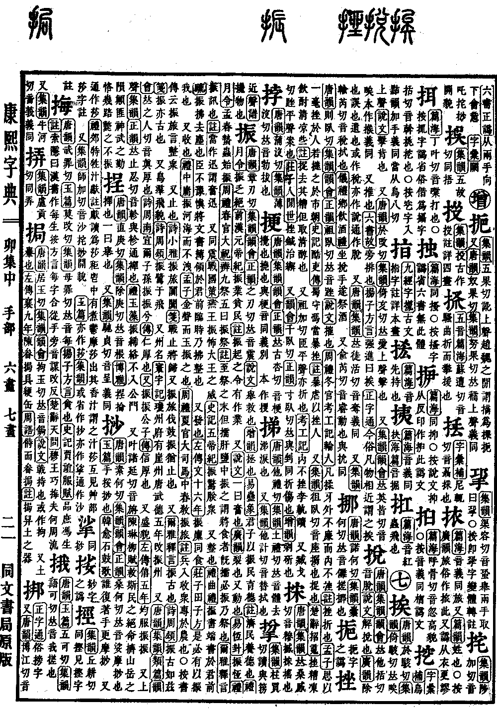 《唐韵》章刃切《集韵》《韵会》《正韵》之刃切,𠀤音震。《说文》举救也。《增韵》拯也。《易·蛊象》君子以振民育德。《注》济民养德也。《礼·月令》振乏绝。《前汉·元帝纪》振业贫民。《注》振起之,令有作业。 又《说文》一曰奋也。《广韵》裂也,又动也。《易·恒卦》振恒。《礼·月令》孟春蛰虫始振。《周礼·春官·大祝》辨九祭,五曰振祭。《注》至祭之末,但擩肝盐中振之,谓将食者既擩,必振乃祭也。《尔雅·释言》振,讯也。《注》当作迅。谓奋迅。 又同震。《战国策》燕王振怖大王之威。《史记·五帝纪》振惊朕众。 又整也。《礼·曲礼》振书端,书于君前。《疏》振,拂去尘也,臣不豫愼,将文书簿领于君前,临时乃拂整也。 又发也。《左传·文十六年》振廪同食。《庄子·田子方》是必有以振我也。 又收也。《礼·中庸》振河海而不泄。《孟子》金声而玉振之也。《周礼·夏官·大司马》中春敎振旅。《注》兵入收众专于农也。◎按书传云:振旅言整众。 又止也。《诗·小雅》振旅阗阗。《笺》战止将归。又振旅伐鼓。振,犹止也。 又《尔雅·释言》振,古也。《诗·周颂》振古如兹。《笺》振亦古也。 又鸟羣飞貌。《诗·周颂》振鹭于飞。 又州名。《寰宇记》琼州府有崖州,唐武德五年改振州。 又《唐韵》《集韵》《类篇》《韵会》𠀤之人切,音真。厚也。《诗·周南》宜尔子孙振振兮。《传》仁厚也。《又》振振公子。《传》信厚也。 又盛貌。《左传·僖五年》均服振振。 又上声。《集韵》《正韵》𠀤止忍切,音轸。与袗通。襌也。《礼·玉藻》振𫄨绤,不入公门。 又叶诸延切,音旃。《𨻰琳·柳赋》救斯民之绝命,挤山岳之陨顚。匪神武之勤恪,几踣毙之不振。