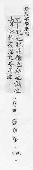 阴险,虚伪,狡诈:~人。~狡。~刁。~佞。~雄。~智(为非作歹的心计)。藏(cáng )~。 不忠于国家或自己一方的人:~细。内~。 男女发生不正当的性行为:~淫。强~(亦指统治者把自己的意志强加于人民,如“~~民意”)。通~。