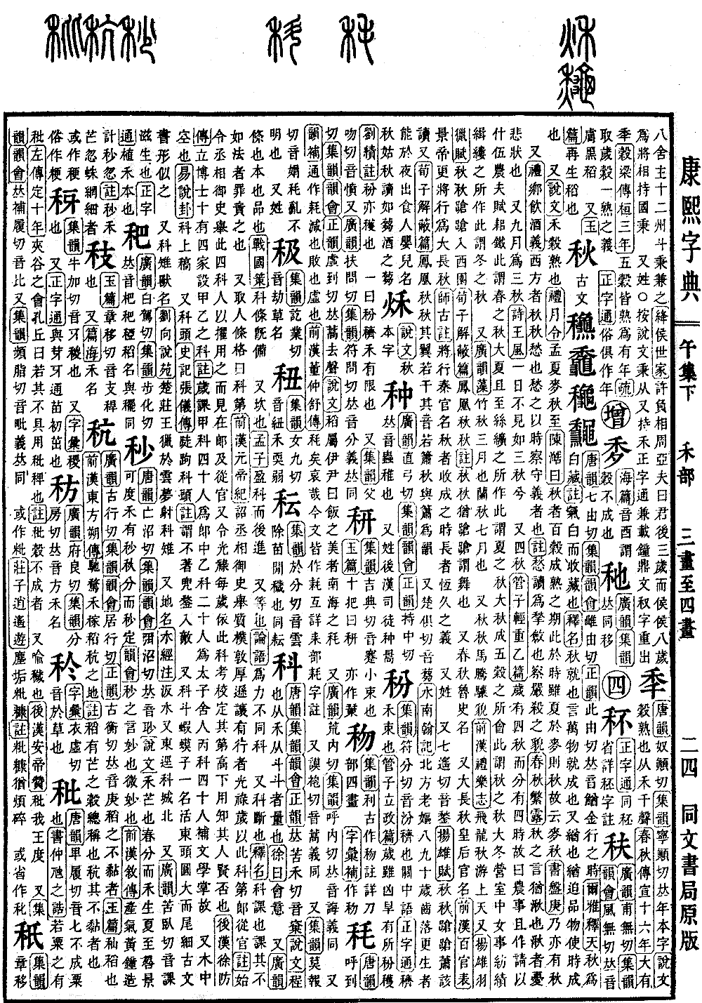 《广韵》直弓切《集韵》《韵会》《正韵》持中切,𠀤音虫。稚也。 又姓。后汉司徒种暠。*(种)〔古文〕𥢖𥡰《广韵》之陇切《集韵》《韵会》主勇切,𠀤音肿。谷种也。《诗·大雅》诞降嘉种。《周礼·地官·草人》以物地相其宜,而为之种。又《夏官·职方氏》豫州,其谷宜五种。《注》黍稷菽麦稻。 又种类。《书·盘庚》无俾易种于兹新邑。《史记·高帝纪》恐事不就后,秦种族其家。《后汉·窦融传》此遗种处也。 又地名。《史记·货殖传》杨平阳𨻰西贾秦翟,北贾种代。《注》种在恒州石邑县,北盖蔚州也。 又外域国名。《后汉·任延传》武威郡,北当匈奴,南接种羌,民畏宼抄,多弃田业。 又《庄子·胠箧篇》舍夫种种之机。《注》种种,谨悫貌。 又《增韵》种种,犹物物也。 又发短貌。《左传·昭三年》余发如此种种。 又《广韵》之用切《集韵》朱用切,𠀤音偅。蓺植也,布也。《书·大禹谟》臯陶迈种德。《注》种,布也。种物必布于地,故为布也。《史记·李斯传》所不去者,医药卜筮种树之书。《前汉·律历志》鹑首初井十六度,芒种。 《正字通》说文种,先穜后孰也。从禾,重声,直容切。穜,蓺也,从禾童声,之用切,分穜种为二。按,诗重穋借用重字,说文似与诗异。又童声,与之用之音反。蓺与种植之种通。周礼种植之种与书传所用种字皆同,当从经传为正。旧音同,音虫,皆非。
