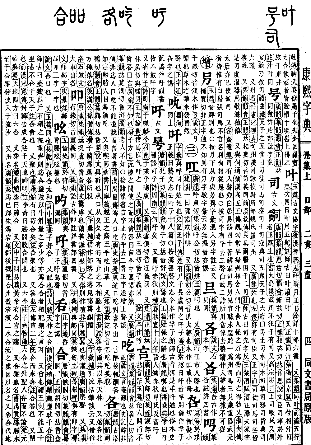 〔古文〕𠮲《唐韵》况于切《集韵》《韵会》匈于切,𠀤音訏。《说文》惊也。《玉篇》疑怪之辞也。《广韵》叹也。《书·尧典》帝曰:吁嚚讼可乎。《诗·周南》云何吁矣。 又留吁,赤狄别种。《春秋·宣十六年》晋人灭赤狄、甲氏及留吁。又省作于。《诗·周南》于嗟麟兮。《召南》于嗟乎驺虞。 又《集韵》云俱切,音迂。义同。 又《集韵》《正韵》𠀤休居切。与嘘同。《王充·论衡》猪马以气吁之。 又《广韵》《集韵》𠀤王遇切,音芋。义同。 《说文》本作吁。吁,字从口从亐。