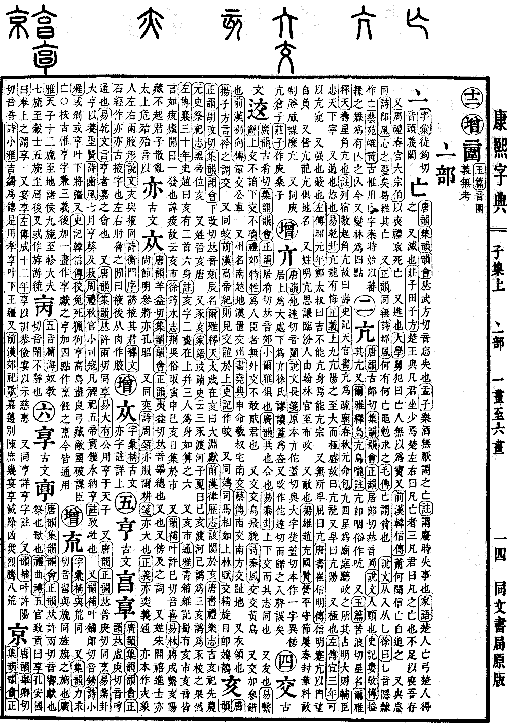 〔古文〕亯𠅖《广韵》《集韵》《韵会》《正韵》𠀤虚庚切,音哼。通也。《易·乾·文言》亨者,嘉之会也。 又《唐韵》《集韵》𠀤许两切,同享。《易·大有》公用亨于天子。 又《唐韵》《正韵》𠀤普庚切,同烹。《易·鼎卦》大亨以养圣贤。《诗·豳风》七月亨葵及菽。《周礼·秋官·小司𡨥》凡禋祀五帝,实镬水纳亨亦如之。《注》致牲也。 又《韵补》叶铺郞切,音镑。《诗·小雅》或剥或亨,叶下将彊。又《史记·韩信传》狡兔死,猎狗亨。高鸟尽,良弓藏。敌国破,谋臣亡。◎按古惟亨字兼三义,后加一画,作享献之享,加四点作烹饪之烹,今皆通用。*考证:〔《周礼·秋官·小司𡨥》凡禋祀五帝,实镬水纳亨。〕 谨照原文纳亨下增亦如之三字,以足文义。 〔按古惟亨字兼三义,后加一画,作享献之亨。〕 谨按文义享献之亨谨改为享献之享。