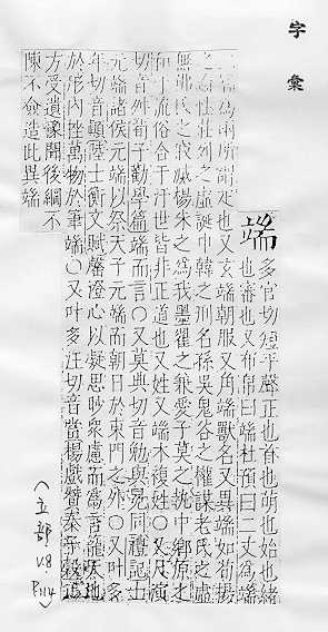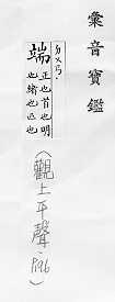 正,不歪斜:~正(a.事物不歪斜;b.正派,正确;c.使端正)。~丽。~然。~庄。~秀。~静。~坐。 正派,正直:~方。~直。~重(zhòng )。品行不~。 事物的一头:~的(dì)(a.事情的经过,底细;b.的确,果然;c.究竟。均亦称“端底”)。~倪。~详。事~。争~。 用手很平正地拿:~盆。~碗。~茶。把问题~出来说清楚。 姓。