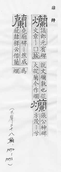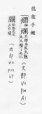 食物熟透而鬆軟。《呂氏春秋•孝行覽•本味》:“故久而不弊,熟而不爛,甘而不噥。”《紅樓夢•第十一回》:“說有好吃的要幾樣,還要很爛的。” 腐敗的、破舊的。如:“爛蘋果”、“破銅爛鐵”。 光明、顯著。如:“燦爛”、“絢爛”。《詩經•鄭風•女曰雞鳴》:“子興視夜,明星有爛。”《漢書•卷九十九•王莽傳上》:“四年于茲,功德爛然。” 紊亂沒頭緒。如:“爛攤子”、“一本爛帳”。 形容人不好、差勁。如:“你這個人太爛了!”