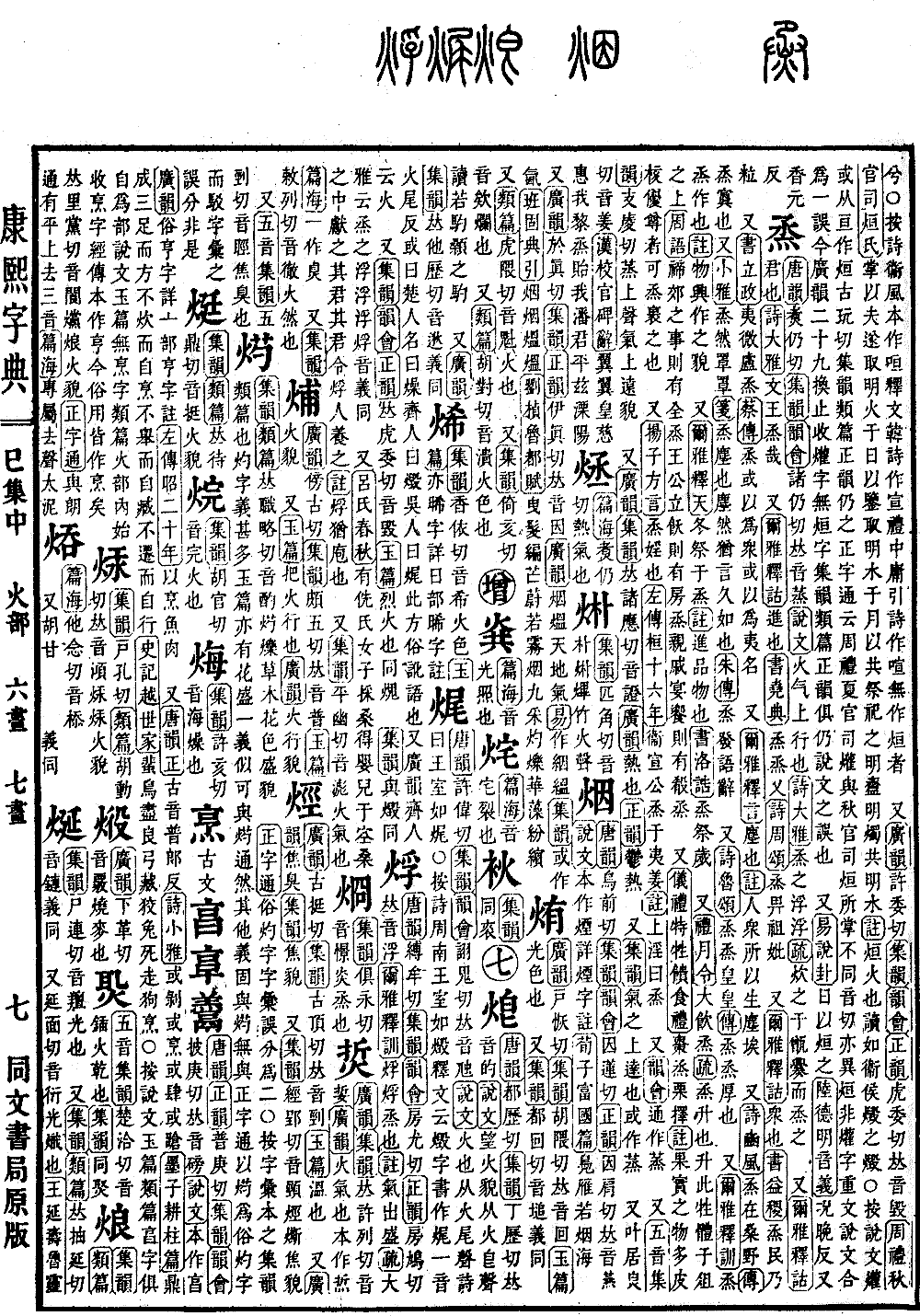 《唐韵》乌前切《集韵》《韵会》因莲切《正韵》因肩切,𠀤音燕。《说文》本作烟。详烟字注。《荀子·富国篇》凫雁若烟海。又《广韵》于真切《集韵》《正韵》伊真切,𠀤音因。《广韵》烟煴天地气。《易》作絪缊。《集韵》或作氤。《班固·典引》烟烟煴煴。《刘桢·鲁都赋》曳发编芒,蔚若雾烟,九采灼烁,华藻纷𦆯。*(烟)〔古文〕𡨾𠖜𡍯《唐韵》乌前切《集韵》《韵会》因莲切《正韵》因肩切,𠀤音燕。《说文》火气也。《周礼·秋官·蝈氏》以其烟被之。 又姓。见《字汇》。 又于真切,音因。《周礼·春官·大宗伯注》禋之言烟也。周人尚臭,烟气之臭闻者。《注》烟音因。《柳宗元·祭从兄文》留连游欢,涉月弥旬,夜𤑔膏炬,昼凌风烟。 《说文》或作烟。《集韵》籀亦作𡇽。