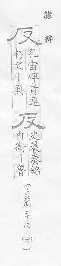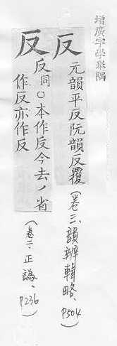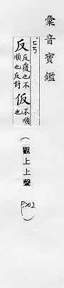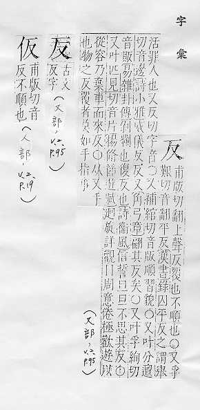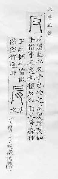 翻转,颠倒:~手(a.翻过手,手到背后;b.反掌)。~复。~侧。 翻转的,颠倒的,与正相对:正~两方面的经验。~间(利用敌人的间谍,使敌人内部自相矛盾)。~诉。~馈。适得其~。物极必~。 抵制,背叛,抗拒:~霸。 和原来的不同,和预感的不同:~常。 回击,回过头来:~驳。~攻。~诘。~思。~躬自问。 类推:举一~三。