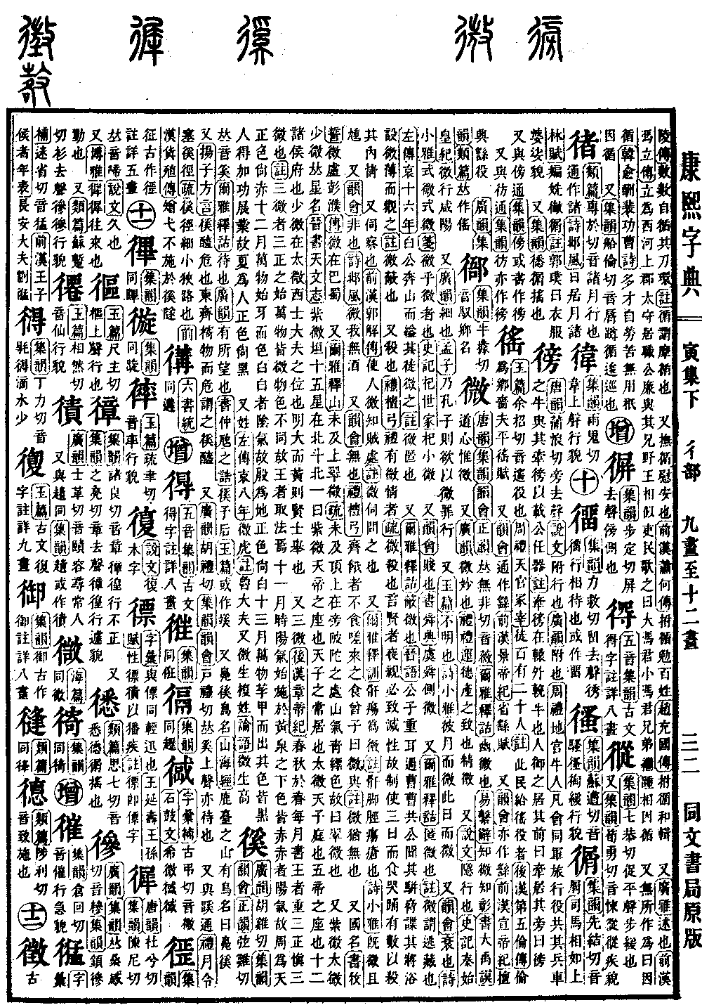 〔古文〕𢾷𢽠𡈼𢽡《唐韵》陟陵切《集韵》《韵会》知陵切,𠀤陟平声。《说文》召也。从微省。𡈼为征,行于微而文达者,即征之。《周礼·天官·宰夫》掌百官府之征令。《注》别异诸官,以备王之征召。《周语》唯官是征。 又《广韵》证也,明也。《书·洪范》念用庶征。《左传·昭三十年》且征过也。《注》征,明也。 又《广韵》成也。《仪礼·士昏礼》纳征。《注》征,成也。使使者纳币以成昏礼。 又问也。《左传·僖四年》包茅不入,王祭不共,无以缩酒,寡人是征。 又敛也。《周礼·地官》闾师以时征其赋。《疏》闾师征敛百里内之赋贡。 又求也。《史记·货殖传》物贱之征贵。《注》征,求也,谓此处物贱,求彼贵卖之。 又《尔雅·释诂》征,虚也。 又姓。《广韵》吴太子率更令河南征崇。 又《集韵》持陵切,音惩。县名。《左传·文十年》泰伯伐晋,取北征。《音义》今征县。《史记·河渠书》穿渠,自征引洛水,至商颜下。《前汉·地理志》左冯翊有征县。《注》即今之澄城是也。 又《广韵》《集韵》《韵会》𠀤陟里切,知上声。《玉篇》宫征也。《尔雅·释乐》征谓之迭。《乐书》声出于心,而齿合吻开,为之征。征,火也,其性烈而善烛。五音配夏。《礼·月令》孟夏之月,其音征。又《乐记》征为事。《疏》征属夏,夏时生长万物,皆成形体。事亦有体,故以征配事也。《风俗通》征者,祉也。物盛大而繁祉也。五行为火,五常为礼,五事为视。凡归为事。 又与惩通。《荀子·正论篇》凡𠛬人之本,禁暴恶恶,且征其来也。 又与征通。《史记·三王世家》非敎士不得从征。 又叶陟隆切,音中。《班固·灵台诗》乃经灵台,灵台既崇。帝勤时登,爰考休征。