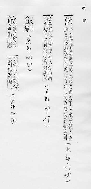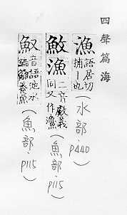 捕魚。如:“竭澤而漁”。宋•歐陽修《醉翁亭記》:“臨溪而漁,溪深而魚肥。” 用不正當的手段掠奪、謀取。《商君書•修權》:“秩官之吏,隱下以漁百姓,此民之蠹也。”《元史•卷一七三• 崔斌傳》:“既至,凡前日蠹國漁民不法之政,悉釐正之。” 與捕魚有關的。如:“漁業”、“漁翁”、“漁船”。 姓。如宋代有漁陽鴻。