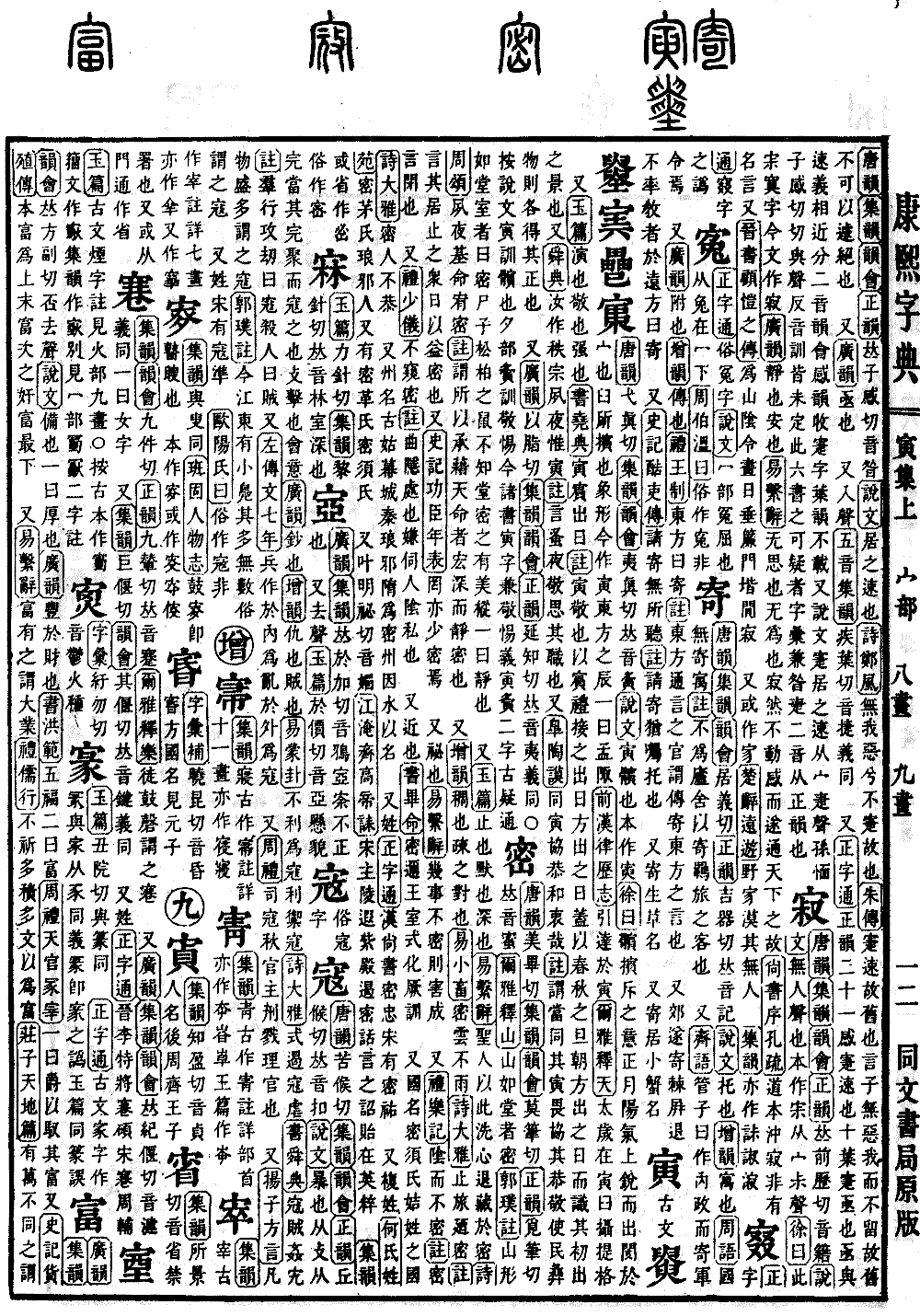 《唐韵》美毕切《集韵》《韵会》莫笔切《正韵》觅笔切,𠀤音蜜。《尔雅·释山》山如堂者密。《郭璞注》山形如堂室者曰密。尸子,松柏之鼠,不知堂密之有美枞。一曰静也。 又《玉篇》止也,默也,深也。《易·系辞》圣人以此洗心,退藏于密。《诗·周颂》夙夜基命宥密。《注》谓所以承藉天命者,宏深而静密也。 又《增韵》稠也,疎之对也。《易·小畜》密云不雨。《诗·大雅》止旅廼密。《注》言其居止之众,日以益密也。又《史记·功臣年表》罔亦少密焉。 又祕也。《易·系辞》几事不密,则害成。 又《礼·乐记》隂而不密。《注》密言闭也。 又《礼·少仪》不窥密。《注》曲隐处也,嫌伺人隂私也。 又近也。《书·毕命》密迩王室,式化厥训。 又国名。密须氏,姞姓之国。《诗·大雅》密人不恭。 又州名。古姑幕城,秦琅邪,隋为密州。因水以名。 又姓。《正字通》汉尚书密忠,宋有密祐。 又复姓。《何氏姓苑》密茅氏,琅邪人。又有密革氏,密须氏。 又叶明祕切,音媚。《江淹·齐高帝诔》宋主陵遐,紫殿遏密。话言之诏,贻在英粹。 《集韵》或省作𡶇,俗作宻。