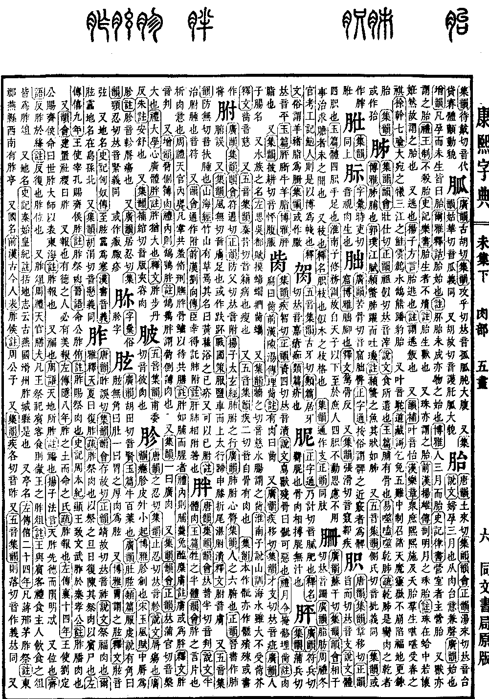 《唐韵》之忍切《集韵》止忍切,𠀤音轸。《说文》唇疡也。《广韵》瘾胗,皮外小起。《博雅》胗,创也。《宋玉·风赋》中唇为胗。《注》胗,音轸,唇疡也。 又《广韵》居忍切《集韵》颈忍切,𠀤音紧。义同。 或作𤷌𦜌疹。