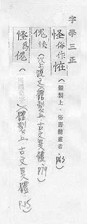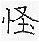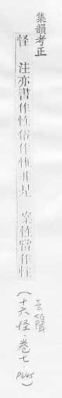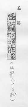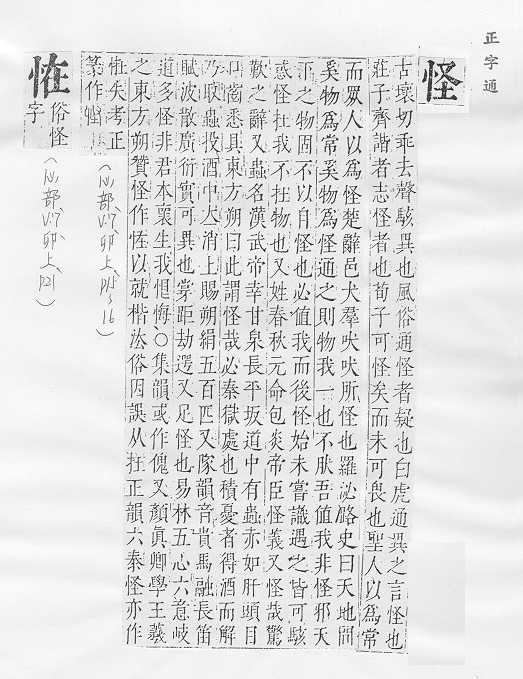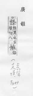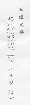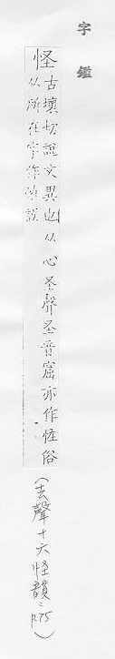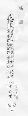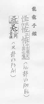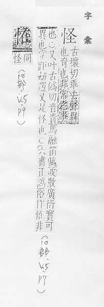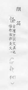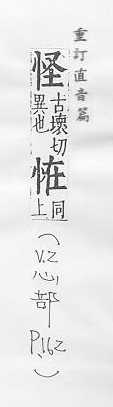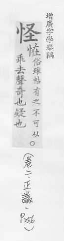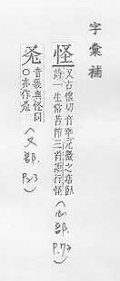 奇异,不平常:~诞(离奇古怪)。~事。~物。~讶。~圈(quān )。~话。~异。奇形~状。 惊奇:大惊小~。~不得。 传说中的妖魔之类:鬼~。妖~。 性情乖僻或行为异样的人:~癖(古怪的癖好)。~僻(古怪)。 很,非常:~好的天气。 怨,责备:不~你。~罪。~怨。
