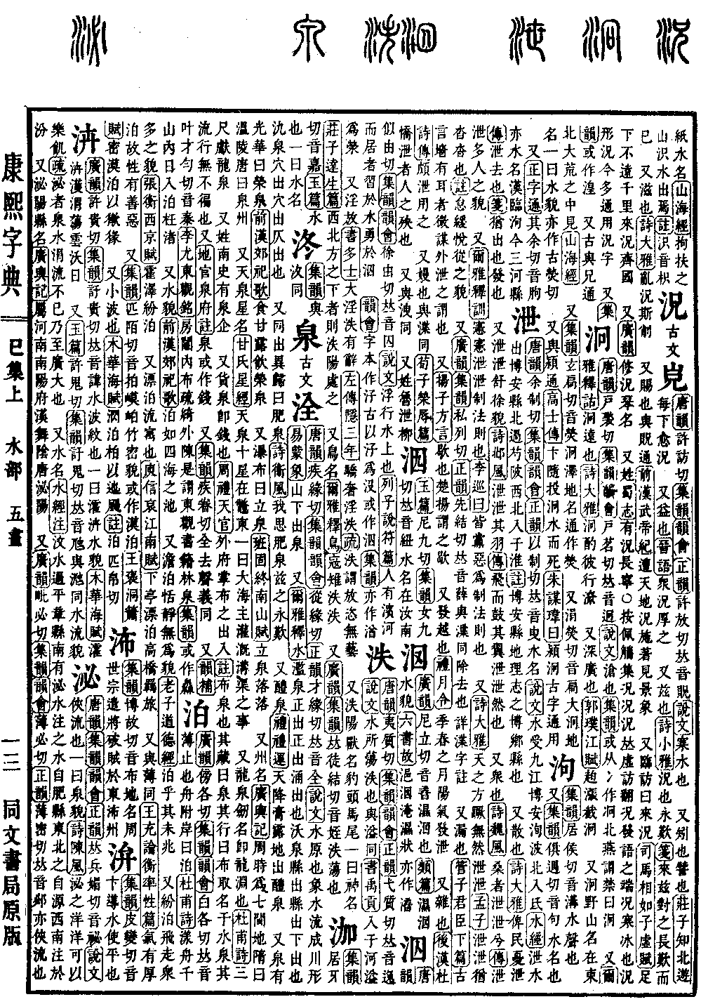 〔古文〕洤《唐韵》疾缘切《集韵》《韵会》从缘切《正韵》才缘切,𠀤音全。《说文》水原也。象水流成川形。《易·蒙象》山下出泉。 又《尔雅·释水》滥泉正出。正出,涌出也。沃泉县出。县出,下出也。氿泉穴出。穴出,仄出也。 又同出异归曰肥泉。《诗·衞风》我思肥泉,兹之永叹。 又醴泉。《礼·礼运》天降膏露,地出醴泉。 又泉有光华曰荣泉。《前汉·郊祀歌》食甘露,飮荣泉。 又瀑布曰立泉。《班固·终南山赋》立泉落落。 又州名。《广舆记》周时为七闽地,隋曰温陵,唐曰泉州。 又天泉,星名。《甘氏星经》天泉十星,在鼈东。一曰大海,主灌漑沟渠之事。 又龙泉,劒名。即龙渊也。《杜甫诗》三尺献龙泉。 又姓。南史有泉企。 又货泉,即钱也。《周礼·天官》外府掌布之出入。《注》布,泉也。其藏曰泉,其行曰布,取名于水泉,其流行无不徧也。又《地官·泉府注》泉,或作钱。 又《集韵》疾眷切,全去声。义同。 又《韵补》叶才匀切,音秦。《李尤·东观铭》房闼内布,疏绮外陈。是谓东观,书籍林泉。《集韵》或作灥。又𤽄、𤿁、𤆁。