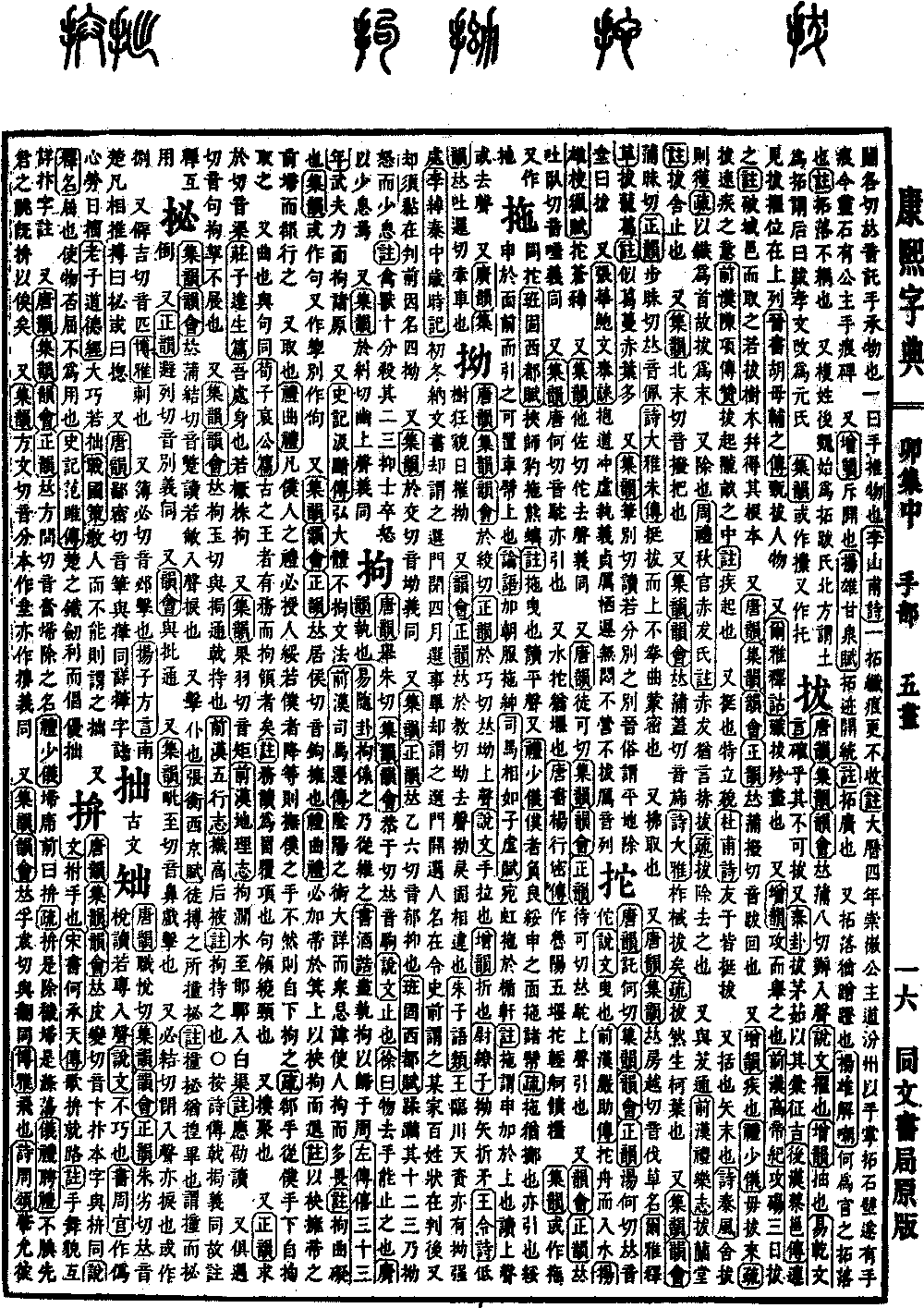 《唐韵》《集韵》《韵会》𠀤蒲八切,办入声。《说文》擢也。《增韵》抽也。《易·乾·文言》确乎其不可拔。又《泰卦》拔茅茹,以其汇征吉。《后汉·蔡邕传》连见拔擢,位在上列。《晋书·胡母辅之传》甄拔人物。 又《尔雅·释诂》歼拔殄,尽也。 又《增韵》攻而举之也。《前汉·高帝纪》攻砀,三日拔之。《注》破城邑而取之,若拔树木幷得其根本。 又《唐韵》《集韵》《韵会》《正韵》𠀤蒲拨切,音跋。回也。 又《增韵》疾也。《礼·少仪》毋拔来。《疏》拔,速疾之意。《前汉·𨻰项传赞》拔起陇亩之中。《注》疾起也。 又挺也。特立貌。《杜甫诗》友于皆挺拔。 又括也。矢末也。《诗·秦风》舍拔则获。《疏》以镞为首,故拔为末。 又除也。《周礼·秋官·赤犮氏注》赤犮犹言捇拔。《疏》拔,除去之也。 又与茇通。《前汉·礼乐志》拔兰堂。《注》拔,舍止也。 又《集韵》北末切,音拨。把也。 又《集韵》《韵会》𠀤蒲盖切,音旆。《诗·大雅》柞棫拔矣。《疏》拔然生柯叶也。 又《集韵》《韵会》蒲昧切《正韵》步昧切,𠀤音佩。《诗·大雅·朱传》挺拔而上,不拳曲蒙密也。 又拂取也。 又《唐韵》《集韵》𠀤房越切,音伐,草名。《尔雅·释草》拔茏葛。《注》似葛,蔓赤,叶多。 又《集韵》笔别切。读若分别之别。晋俗谓平地除𡊅曰拔。 又《张华·鲍文泰诔》抱道冲虚,执义贞厉。栖迟无闷,不营不拔。厉音列。
