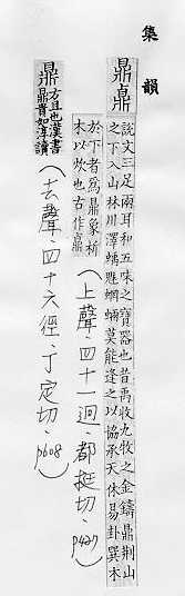 古代烹煮用的器物,一般是三足两耳:铜~。~食(列鼎而食,指豪侈生活)。~镬。 锅:~罐。~锅。 古代视为立国的重器,是政权的象征:~彝。九~。定~。问~。~祚(国运)。 象征三方并立、互相对峙:~峙。~足之势。 大:~族。~臣。~力支持。 正当,正在:~盛(shèng )。