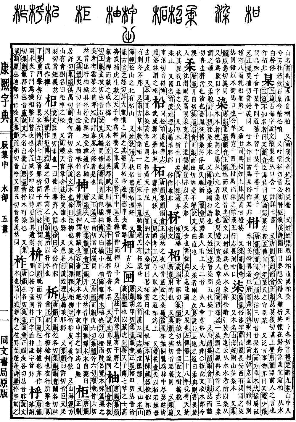 《唐韵》《正韵》居许切《集韵》俱禹切《韵会》句许切,𠀤音举。《说文》木也。《徐曰》柜柳也,大叶木。《尔雅·释木》柜柳。《注》似柳,皮可煑作飮。 又《山海经》方山有靑树,名曰柜格之松。 又《周礼·天官·掌舍注》柜受,溜水器。 又邑名。《前汉·地理志》属琅邪郡。 又《集韵》臼许切,音巨。又果羽切,音矩。义𠀤同。 或作榉。