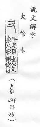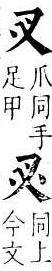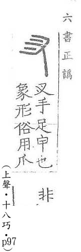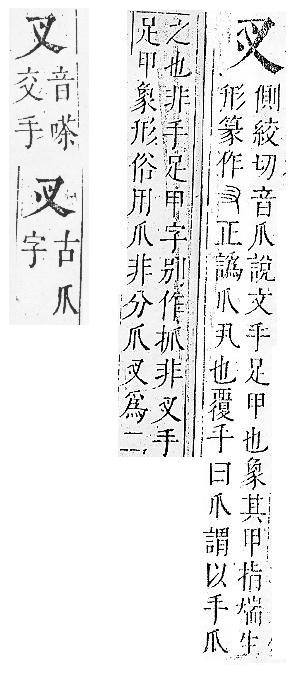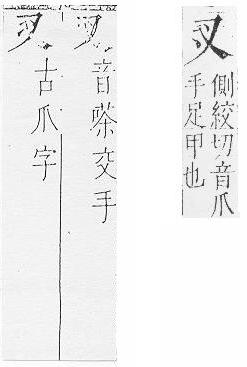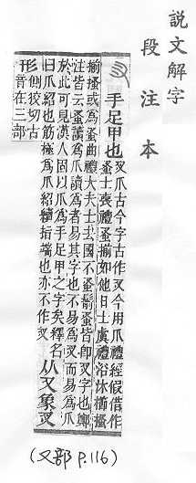 手足甲,後作「爪」。說文解字:「,手足甲也。」段玉裁.注:「、爪,古今字。古作,今用爪。」