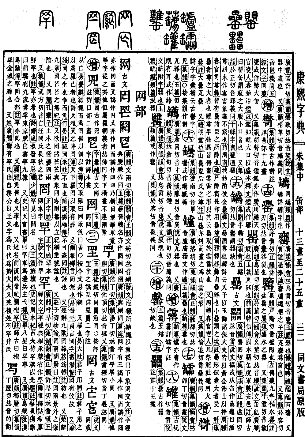〔古文〕𠕃𦉽𦋟𦉮《广韵》文两切《集韵》《韵会》《正韵》文纺切,𠀤音网。《说文》庖牺所结绳以渔。从冂,下象网交文。《注》今经典变隷作罒。《玉篇》罗罟总名。亦作𦁒、罔、𠕈、𦉯。《广韵》与网同。《篇海》网字有三譌:本作网而譌作𦉳,亦作冈而又譌作𠔿,又亦作𦉰而譌作罒。罒乃横目,惟睪眔睘等字从之,其他但属罗网义者,𠀤系𦉰字下横画,不连两旁。*(网)《广韵》文两切《集韵》《韵会》《正韵》文纺切,𠀤音罔。《说文》本作网。或作𦉽,隷省作㒺。今文从糸作纲。《易·系辞》作结绳而为㒺罟,以佃以渔。《朱子·本义》㒺,与纲同。《书·盘庚》若纲在纲。《诗·邶风》鱼纲之设。 又《楚辞·招魂》纲戸朱缀。《注》纲戸,绮文缕也。