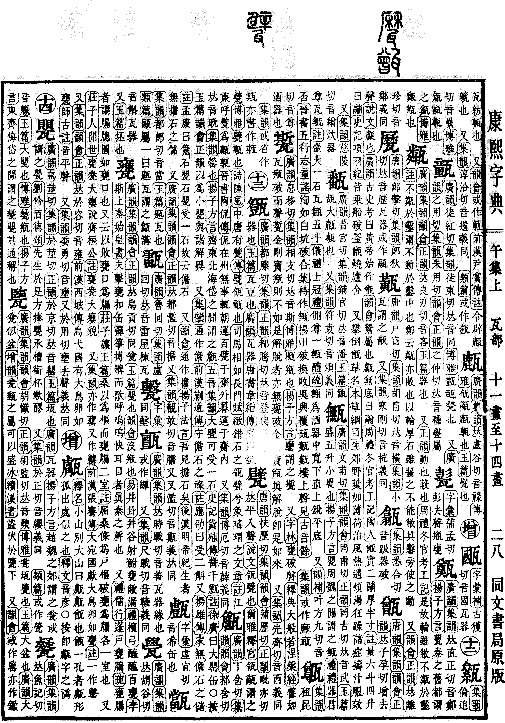《唐韵》《集韵》《韵会》《正韵》𠀤子孕切,增去声。《说文》甗也。《广韵》古史考曰:黄帝始作甑。《韵会》𩰿属也。甗无底曰䰝。《周礼·冬官考工记陶人》甑实二鬴,厚半寸。《注》量六斗四升曰鬴。《史记·项羽纪》皆沉船,破釜甑,烧庐舍。 又攀倒甑,草名。《本草纲目》生郊野,叶如薄荷,治风热。遇烦渴狂躁诸症,擣汁服,效。 又《集韵》慈陵切,音缯。炊器。*考证:〔《史记·项羽纪》皆乗船,破釜甑。〕 谨照原文乗船改沉船。
