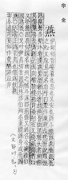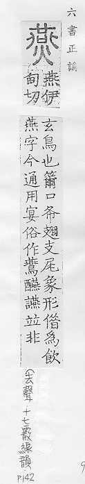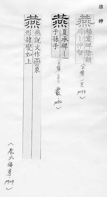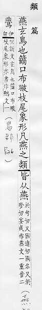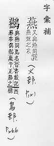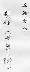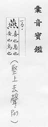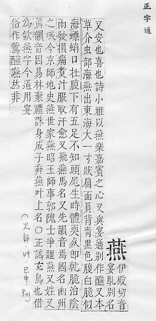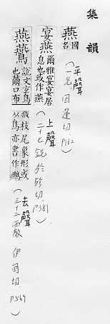 鸟类的一科,候鸟,常在人家屋内或屋檐下用泥做巢居住,捕食昆虫,对农作物有益:~尔(形容新婚夫妇亲睦和美的样子)。~好(常用以指男女相爱)。~侣。~雀处(chǔ)堂(喻居安而不知远虑,临祸却不能自知)。 轻慢:“~朋逆其师”。 古同宴,安闲,安乐。 古同宴,宴饮。
