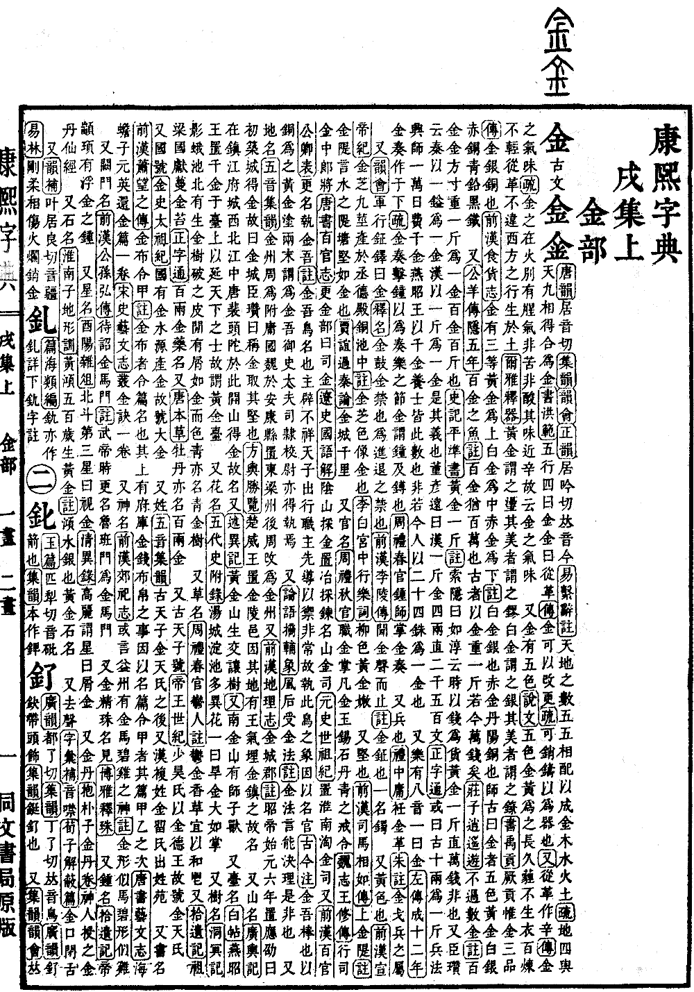 〔古文〕𨤾𨥄《唐韵》居音切《集韵》《韵会》《正韵》居吟切,𠀤音今。《易·系辞注》天地之数,五五相配以成金木水火土。《疏》地四与天九相得,合为金。《书·洪范》五行,四曰金,金曰从革。《传》金可以攺更。《疏》可销铸以为器也。《又》从革作辛。《传》金之气味。《疏》金之在火,别有腥气,非苦非酸,其味近辛,故云金之气味。 又金有五色。《说文》五色金,黄为之,长久薶,不生衣。百炼不轻,从革不违,西方之行,生于土。《尔雅·释器》黄金谓之璗,其美者谓之镠,白金谓之银,其美者谓之镣。《书·禹贡》厥贡惟金三品。《传》金银铜也。《前汉·食货志》金有三等,黄金为上,白金为中,赤金为下。《注》白金,银也。赤金,丹阳铜也。师古曰:金者五色,黄金、白银、赤铜、靑铅、黑铁。 又《公羊传·隐五年》百金之鱼。《注》百金,犹百万也。古者以金重一斤,若今万钱矣。《庄子·逍遥游》不过数金。《注》百金,金方寸,重一斤为一金。百金,百斤也。《史记·平准书》黄金一斤。《注》索隐曰:如淳云:时以钱为货,黄金一斤直万钱,非也。又臣瓒云:秦以一镒为一金,汉以一斤为一金,是其义也。董彦远曰:汉一斤金四两,直二千五百文。《正字通》或曰古十两为一斤。兵法:兴师一万,日费千金。燕昭王以千金养士,皆此数也。非若今人以二十四铢为一金也。 又乐有八音,一曰金。《左传·成十二年》金奏作于下。《疏》金奏,击钟以为奏乐之节。金,谓钟及镈也。《周礼·春官·钟师》掌金奏。 又兵也。《礼·中庸》衽金革。《朱注》金戈兵之属。 又《韵会》军行钲铎曰金。《释名》金鼓。金,禁也,为进退之禁也。《前汉·李陵传》闻金声而止。《注》金,钲也。一名镯。 又黄色也。《前汉·宣帝纪》金芝九茎,产于函德殿铜池中。《注》金芝,色像金也。《李白·宫中行乐词》柳色黄金嫩。 又坚也。《前汉·司马相如传》上金隄。《注》金隄,言水之隄塘,坚如金也。《贾谊·过秦论》金城千里。 又官名。《周礼·秋官》职金掌凡金、玉、锡、石、丹靑之戒令。《魏志·王修传》行司金中郞将。《唐书·百官志》更金部曰司金。《辽史·国语解》隂山采金置冶采炼,名山金司。《元史·世祖纪》置淮南淘金司。又《前汉·百官公卿表》更名执金吾。《注》金吾,鸟名也,主辟不祥。天子出行,职主先导,以御非常,故执此鸟之象,因以名官。《古今注》金吾,棒也。以铜为之,黄金涂两末,谓为金吾御史大夫。司隷校尉,亦得执焉。 又《论语·摘辅象》风后受金法。《注》金法,言能决理是非也。 又地名。《五音集韵》金州,周为附庸国,魏于安康县置东梁州,后周攺为金州。又《前汉·地理志》金城郡。《注》昭帝始元六年置。应劭曰:初筑城得金,故曰金城。臣瓒曰:称金,取其坚也。《方舆胜览》楚威王置金陵邑,因其地有王气,埋金镇之,故名。 又山名。《广舆记》在镇江府城西北江中,唐裴头陀于此开山得金,故名。又《述异记》黄金山,生交让树。《又》南金山有师子兽。 又台名。《白帖》燕昭王置千金于台上,以延天下之士,故谓黄金台。 又花名。《五代史·附录》汤城淀池多异花。一曰旱金,大如掌。 又树名。《洞冥记》影蛾池北有生金树。破之皮闲有屑,如金而色靑,亦名靑金树。 又草名。《周礼·春官·郁人注》郁金香草,宜以和鬯。又《拾遗记》祖梁国献蔓金苔。《正字通》百两金,药名。又《唐本草》牡丹,亦名百两金。 又古天子号。《帝王世纪》少昊氏以金德王,故号金天氏。又国号。《金史·太祖纪》国有金水,源产金,故号大金。 又姓。《五音集韵》古天子,金天氏之后。又汉复姓。金留氏,出《姓苑》。 又书名。《前汉·萧望之传》金布令甲。《注》金布者,令篇名也。其上有府库金钱布帛之事,因以名篇令甲者其篇甲乙之次。《唐书·艺文志》海蟾子元英还金篇一卷。《宋史·艺文志》丛金诀一卷。 又神名。《前汉·郊祀志》或言益州有金马碧鸡之神。《注》金形似马,碧形似鸡。 又阙门名。《前汉·公孙弘传》待诏金马门。《注》武帝时更名鲁班门为金马门。 又金精,珠名。见《博雅释珠》。 又钟名。《拾遗记》帝颛顼有浮金之钟。 又星名。《酉阳杂俎》北斗第三星曰视金。《淸异录》高丽谓星曰屑金。 又金丹。《抱朴子·金丹卷》神人授之金丹仙经。 又石名。《淮南子·地形训》黄澒五百岁生黄金。《注》澒,水银也。黄金,石名。 又去声。《字汇补》音噤。《荀子·解蔽篇》金口闭舌。 又《韵补》叶居良切,音疆。《易林》刚柔相伤,火烂销金。*考证:〔《前汉·宣帝纪》金芝九茎,产于丞德殿铜池中。〕 谨照原文丞德殿改函德殿。