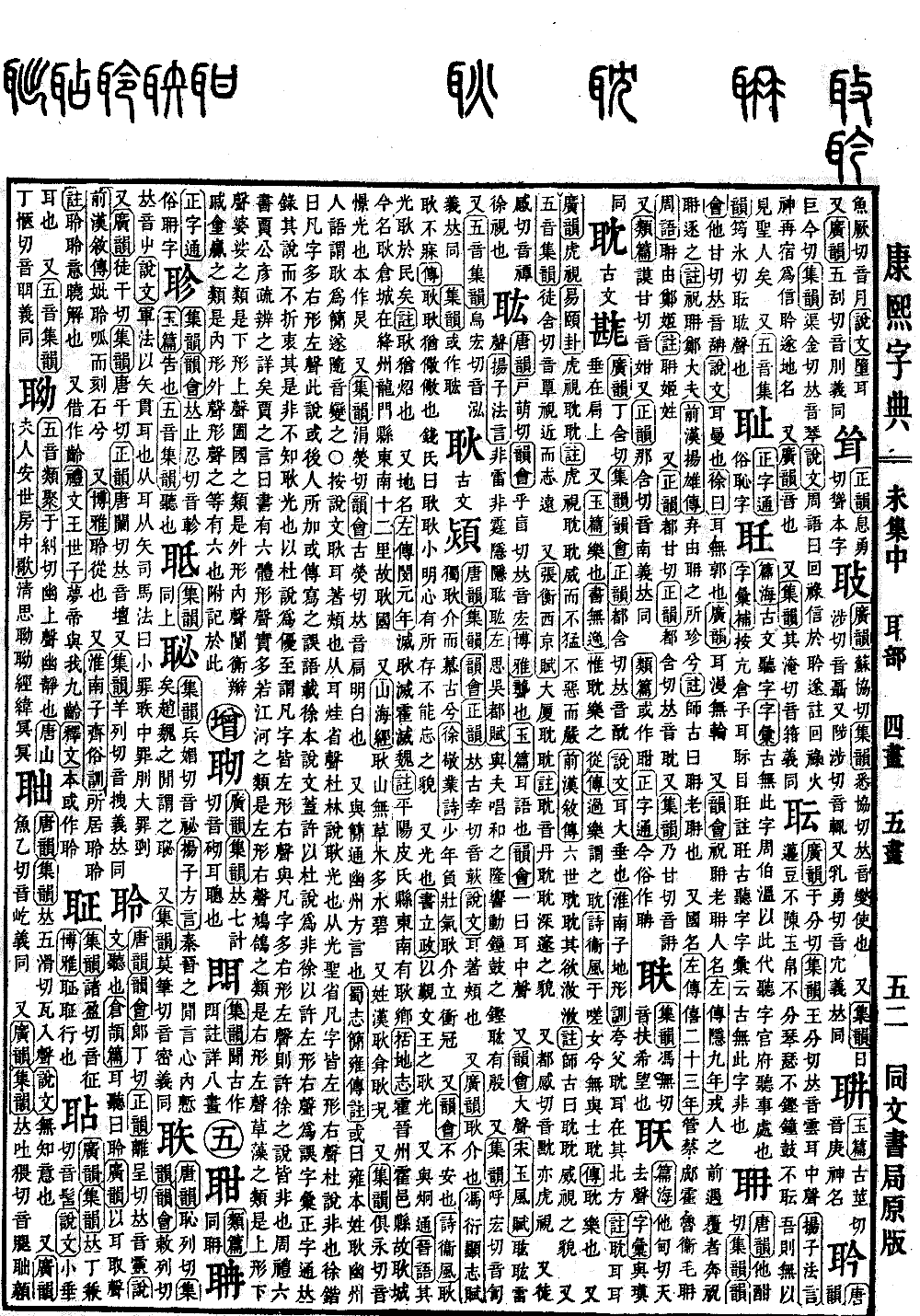 《唐韵》他酣切《集韵》《韵会》他甘切,𠀤音舑。《说文》耳曼也。《徐曰》耳无郭也。《广韵》耳漫无轮。 又《韵会》祝耼,老耼,人名。《左传·隐九年》戎人之前,遇覆者奔,祝耼逐之。《注》祝耼,郑大夫。《前汉·扬雄传》弃由耼之所珍兮。《注》师古曰:耼,老耼也。 又国名。《左传·僖二十三年》管蔡郕霍,鲁衞毛耼。《周语》耼由郑姬。《注》耼,姬姓。 又《正韵》都甘切《正韵》都含切,𠀤音耽。又《集韵》乃甘切,音䛁。又《类篇》谟甘切,音姏。又《正韵》那含切,音南。义𠀤同。 《类篇》或作𦕐。《正字通》今俗作聃。