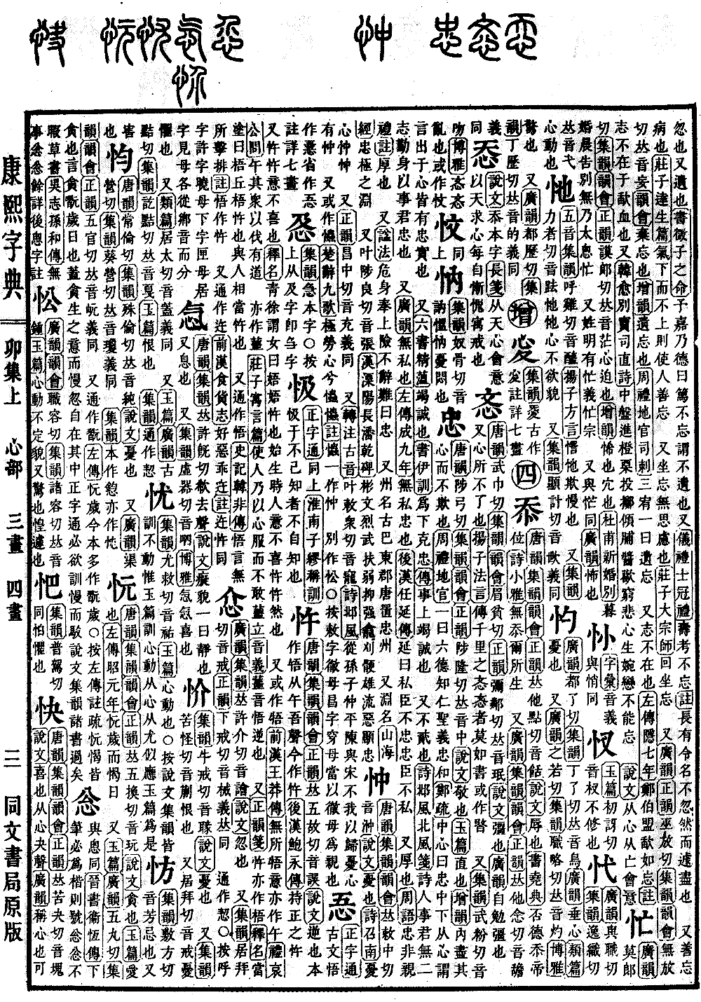 《唐韵》《集韵》《韵会》《正韵》𠀤苦夬切,音块。《说文》喜也,从心夬声。《广韵》称心也,可也。《后汉·盖勋传》王允曰:欲得快,司隶校尉,谁可作者。 又《增韵》爽快也,急疾也。 又《战国策》恭于敎而不快。《注》谓纵逸也。 又《辍耕录》世谓有疾曰不快。《后汉·华佗传》体有不快。 又姓。 又叶窥贵切,音愧。《易·旅卦》心未快也,叶旅于处,未得位也。《扬子·太𤣥经》不宴不雅,礼乐废也。拂系绝纗,心诚快也。 本作𢘦。俗省作快。