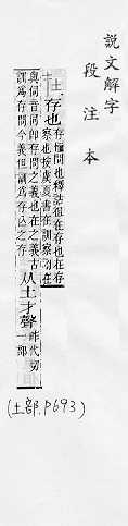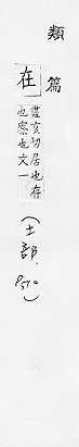 存,居:存~。健~。青春长~。 存留于某地点:~家。~职。~位。 关于某方面,指出着重点:~于(a.指出事物的本质所在,或指出事物以什么为内容;b.决定于)。~乎。事~人为。 表示动作的进行:他~种地。 介词,表示事情的时间、地点、情形、范围等:~逃。~望。~握。~理。~朝(cháo )。~野。~世。 和所连用,表示强调:~所不辞。无所不~。
