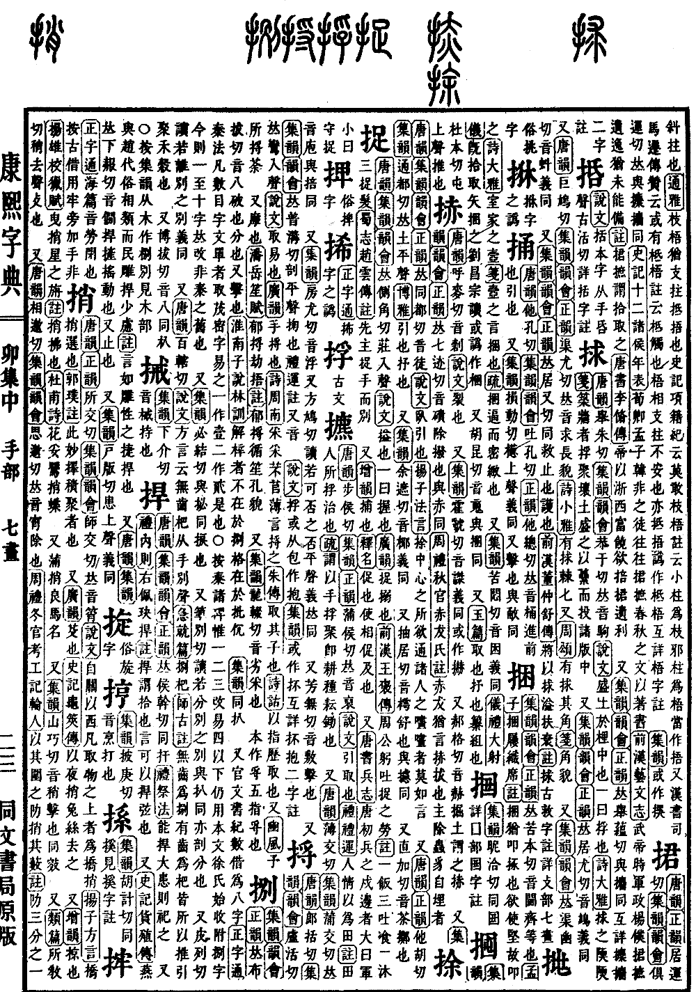 《唐韵》郞括切《集韵》《韵会》卢活切,𠀤鸾入声。《说文》取易也。《广韵》手捋也。《诗·周南》采采芣苢,薄言捋之。《朱传》取其子也。《诗诂》以指历取也。又《豳风》予所捋荼。 又摩也。《潘岳·笙赋》郁捋劫捂。《注》郁捋,循笙孔貌。 又《集韵》龙辍切,音劣。采也。 本作寽,五指寽也。