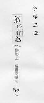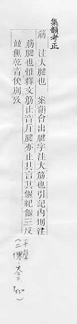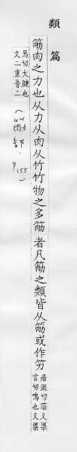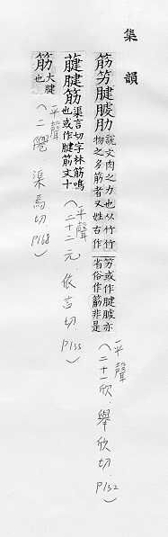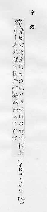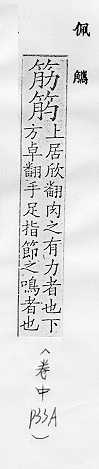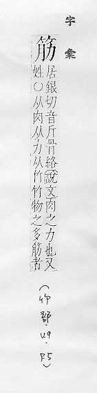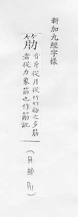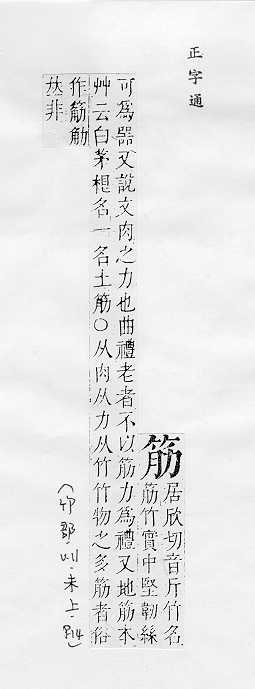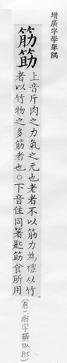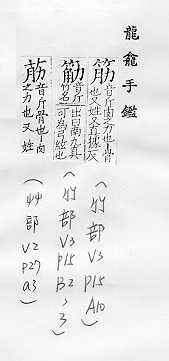 肌肉的俗称:~力。~肉。~疲力尽。 肌腱或附着在骨头上的韧带:~骨。~道(道读轻声)。蹄~。 可见的皮下静脉的俗称:~络。~脉。青~暴露。 像筋的东西:钢~。橡皮~儿。