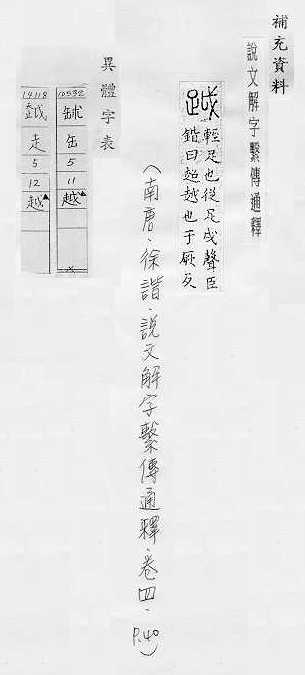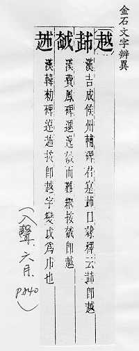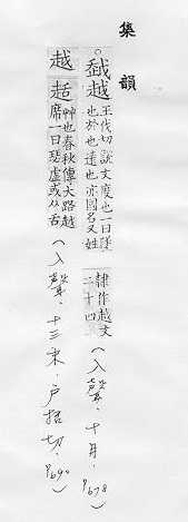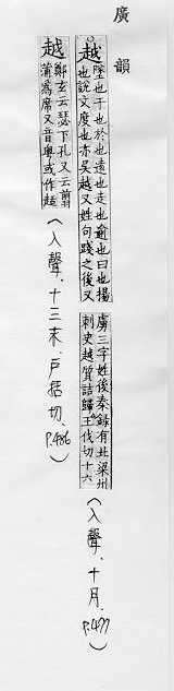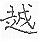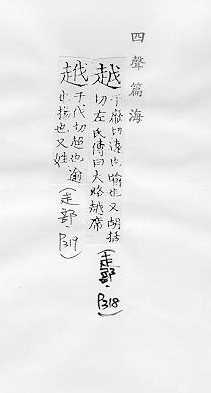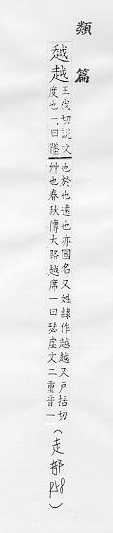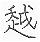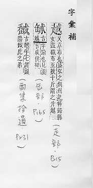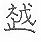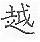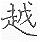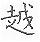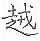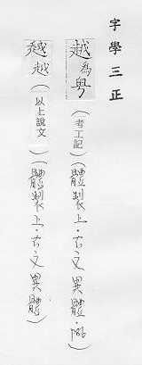 度过,超出:~过。~冬。~级。~轨。~权。~境。~位。~狱。~俎代庖。 声音、情感扬起,昂扬:激~。声音清~。 表示程度加深:~发(更加)。~加。~快~好。 消散:“精神劳则~”。 失坠,坠落:陨~。“射其左。~于车下”。 中国古民族名:百~(亦作“百粤”)。 中国周代诸侯国名。后用作浙江省东部的别称:~剧。~凫楚乙(乙,燕子。喻对于同一事物,由于自身条件的局限而作出不同的判断)。 姓。