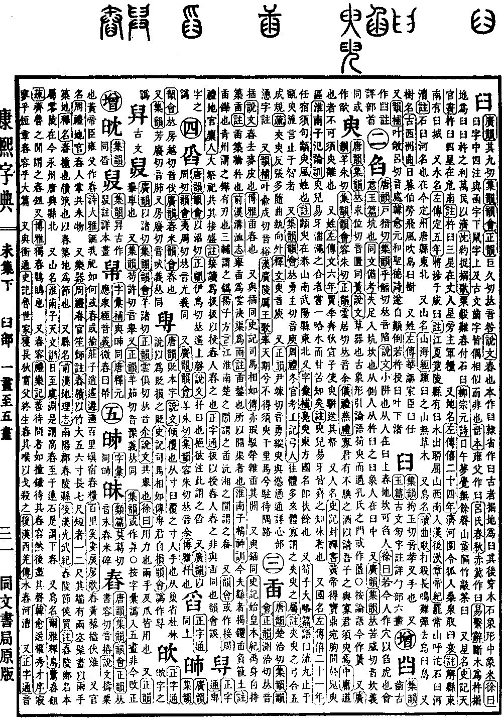 《广韵》其九切《集韵》《韵会》《正韵》巨久切,𠀤音咎。《说文》舂也。本作𠚒,隷省作臼。古者掘地为臼,其后穿木石。象形,中象米。《徐曰》臼字中四注,与函字下,鼠字上,及古文齿字,皆偶相似而非也。《世本》雍父作臼。《吕氏春秋》赤冀作臼。《易·系辞》断木为杵,掘地为臼。臼杵之利,万民以济。《沈约·捉搦歌》粟榖难舂付石臼。《柳宗元诗》日午梦觉无余声,山童隔竹敲茶臼。 又星名。《史记·天官书》杵臼四星,在危南。《注》杵臼三星,在丈人星旁,主军粮。 又地名。《左传·僖二十四年》济河围令狐,入桑泉,取臼衰。《注》解县东南有臼城。 又水名。《左传·定五年》将涉于成臼。《注》江夏竟陵县有臼水,出𦖂屈山,西南入汉。《后汉·章帝纪》罢常山,呼沱石臼河漕。《注》石臼,河名也,在今定州唐县东北。 又山名。《山海经》踵臼之山,无草木。 又鸟名。《读曲歌》打杀长鸣鸡,弹去乌臼鸟。 又树名。《古西洲曲》日暮伯劳飞,风吹乌臼树。 又姓。《左传》华讴家臣臼任。又《韵补》叶敞吕切,音处。《韩愈·元和圣德诗》遂自顚倒,若杵投臼。叶下渚。