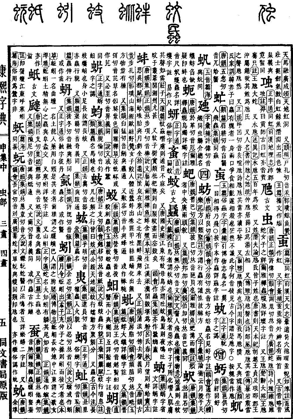 〔古文〕蟁《唐韵》《正韵》𠀤无分切,音文。《说文》囓人飞虫也。《续博物志》地湿则生蚊。《大戴礼》白鸟者,谓蚊蚋也。《尔雅翼》蚊者,恶水中孑孑所化,噆人肌肤,其声如雷。《庄子·天运篇》蚊蝱噆肤,则通昔不寐矣。 又《唐国史补》江东有蚊母鸟,亦谓吐蚊鸟,夏则夜鸣,吐蚊于丛苇闲,湖州尤甚。 又蚊子树,实类枇杷,熟则自裂,蚊尽而空壳矣。 《韵会》作蟁。《集韵》亦作𧓹𧏎䘇。